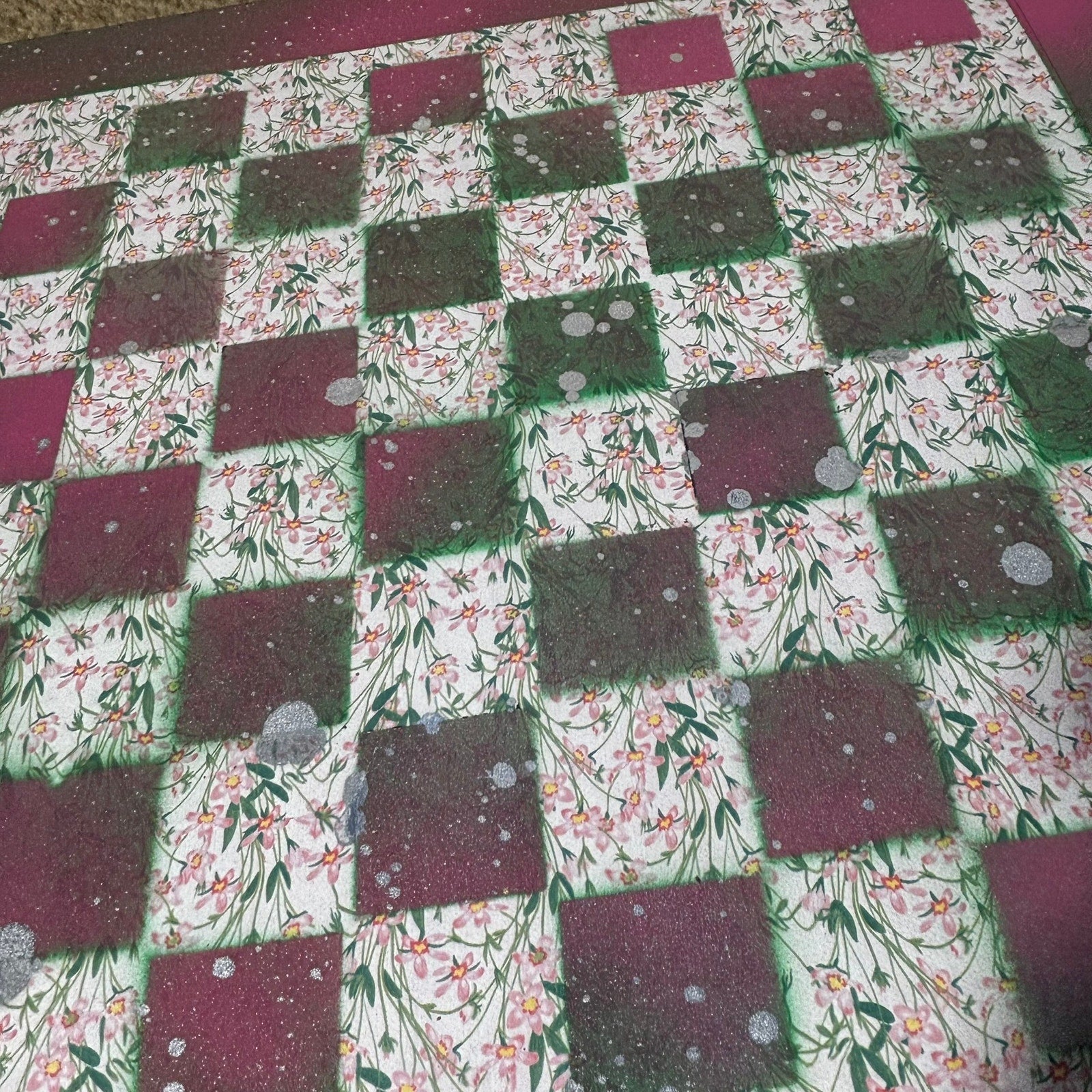 The chessboard is crafted from a 16x16 inch particle board, featuring a 12x12 inch scrapbook paper playing area. Both the board and squares are hand-painted with care, making each set truly unique. Add a touch of artistry to your game night with this beautiful chess set!