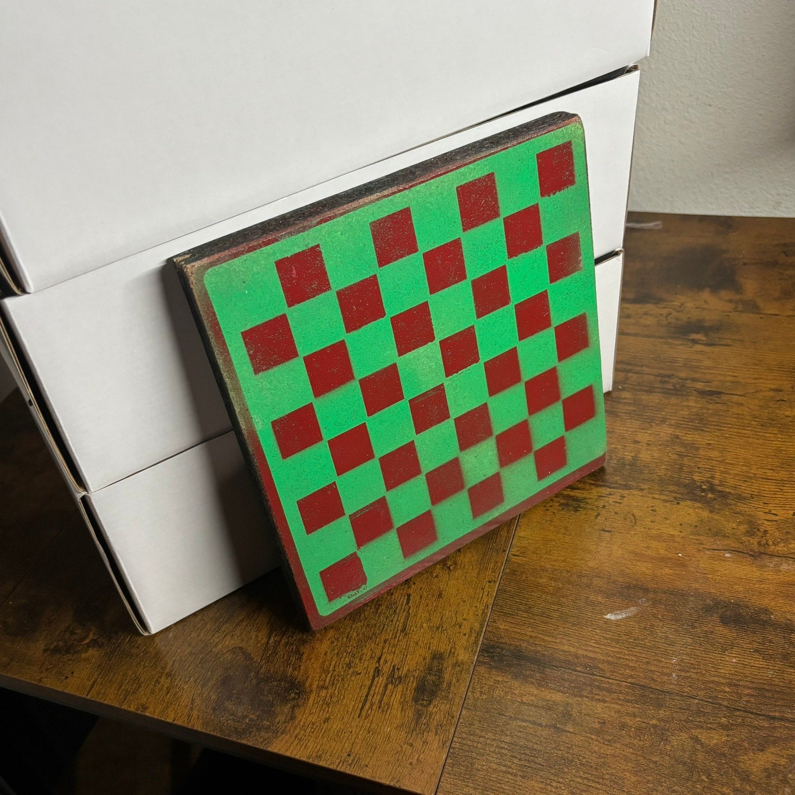 This is a one-of-a-kind, hand-painted chess board that will add a touch of artistry to your game. These are spray painted particle boards and have a double side. One side is painted and the backside is lined with scrapbook paper and has a different design. (The Scrapbook paper part is not meant to be played on but you can!)