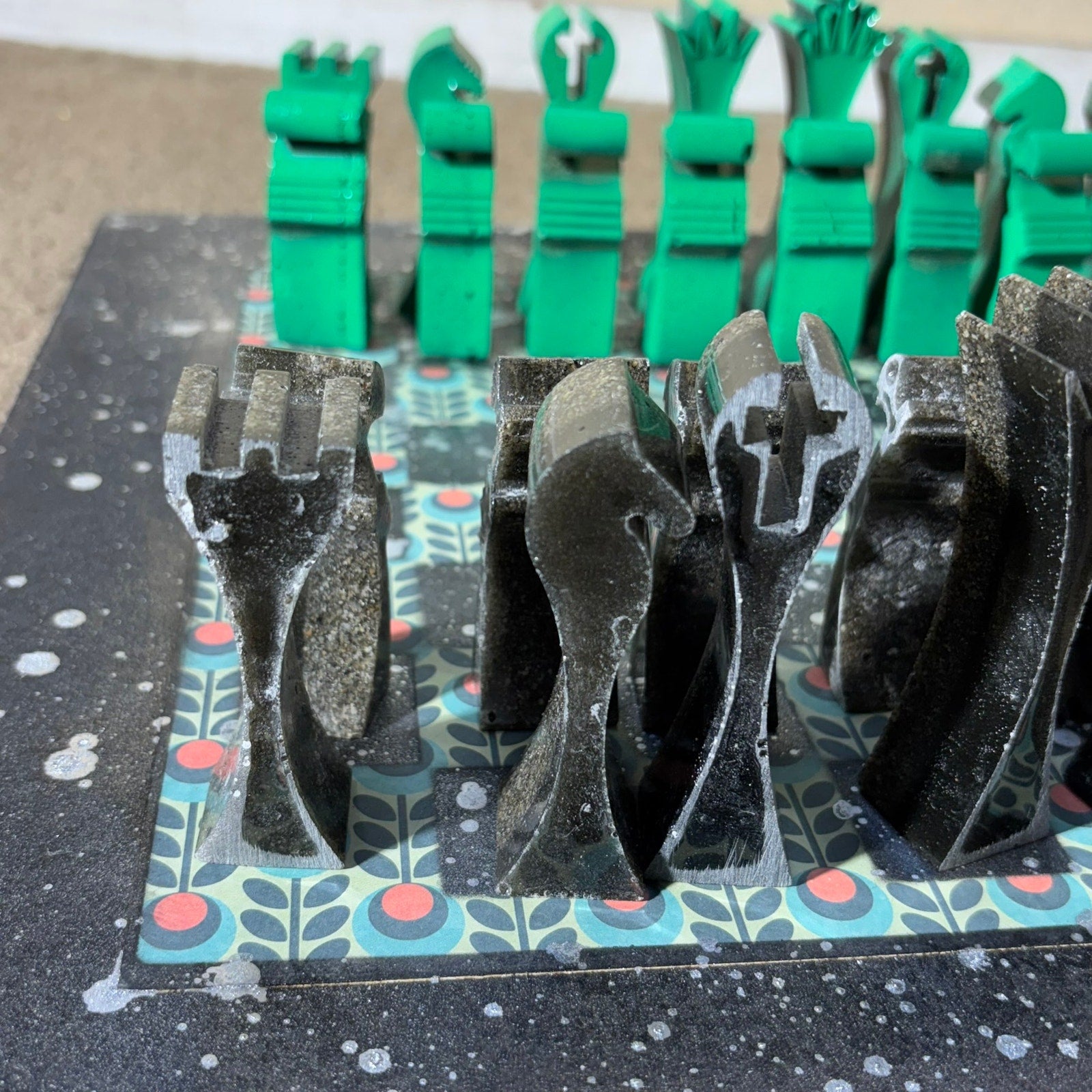 This unique chess set is a one-of-a-kind creation, perfect for chess enthusiasts and collectors! The chess pieces are handmade from resin and mixed with sand rock, giving them a substantial and satisfying weight.