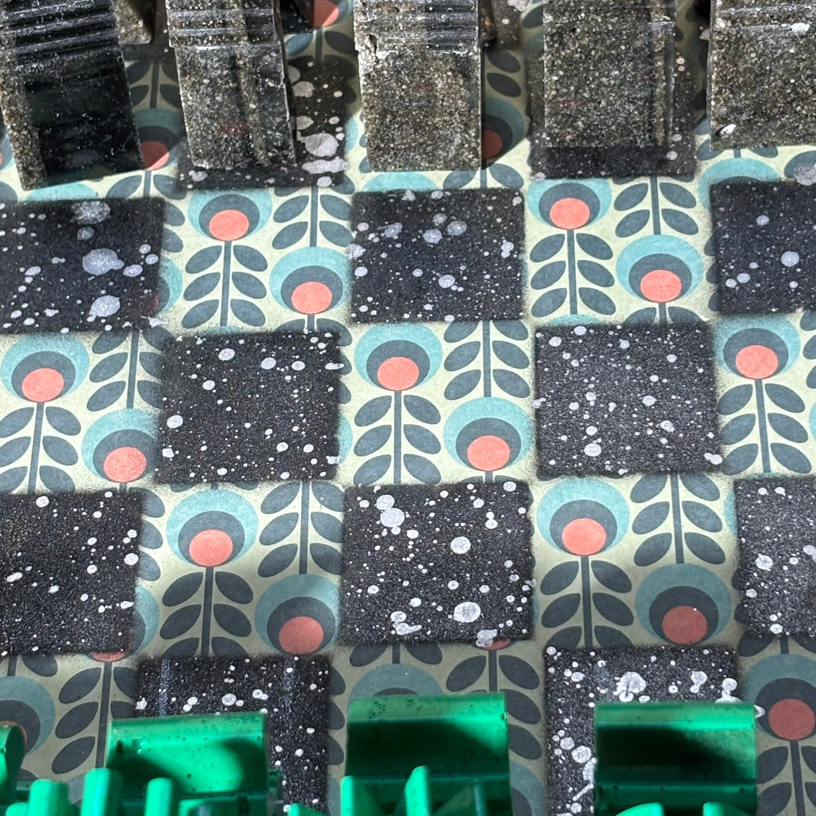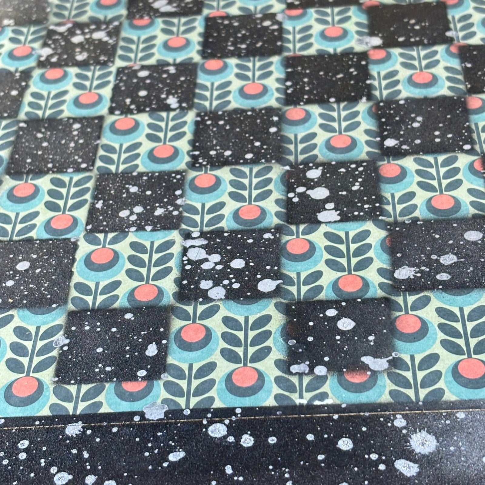The chessboard is crafted from a 16x16 inch particle board, featuring a 12x12 inch scrapbook paper playing area. Both the board and squares are hand-painted with care, making each set truly unique. Add a touch of artistry to your game night with this beautiful chess set!