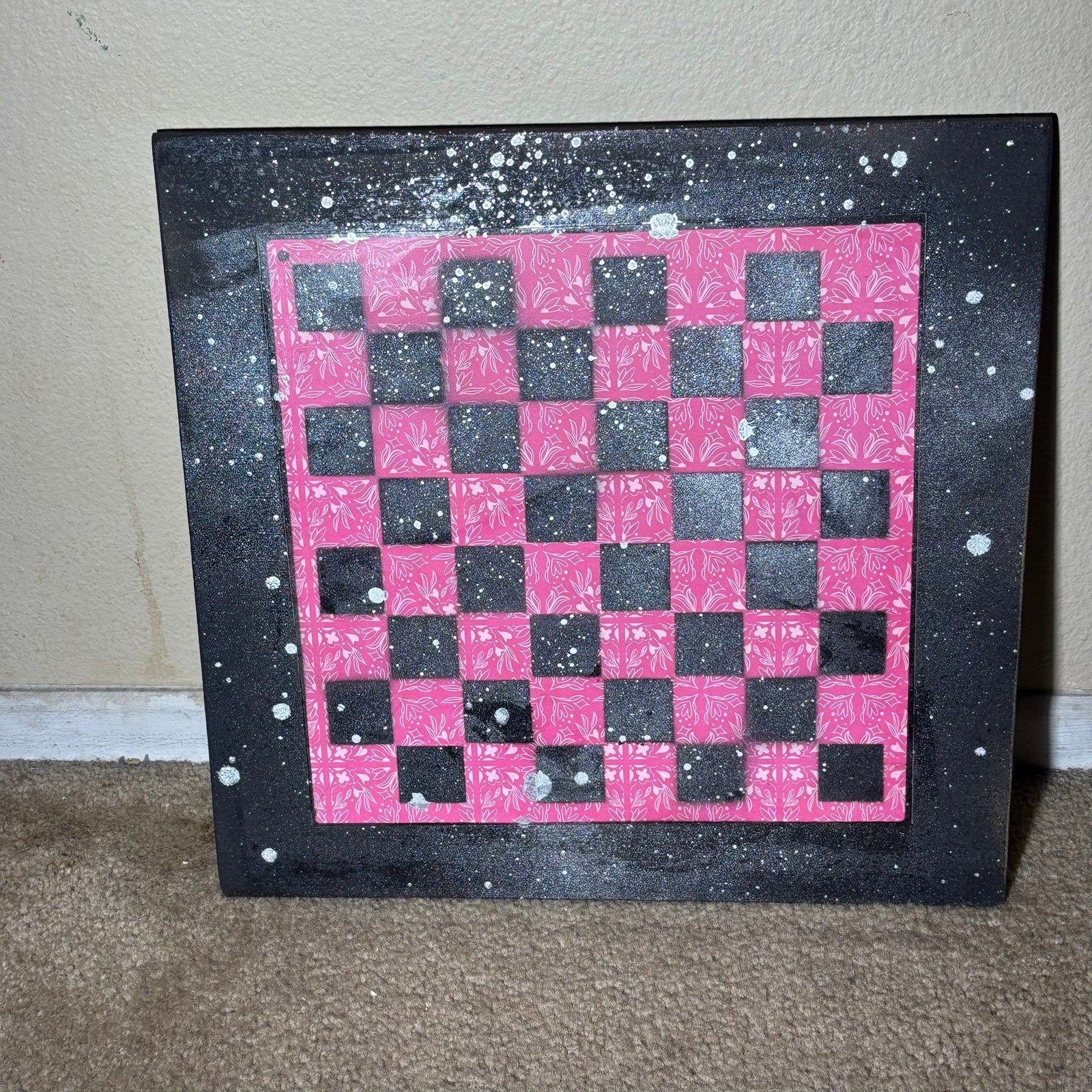 The board is crafted from durable particle board, painted with care to create the classic chess square pattern. What makes this board special is the unique 12x12 piece of scrapbook paper inlaid in the center, adding a personal touch to your game.