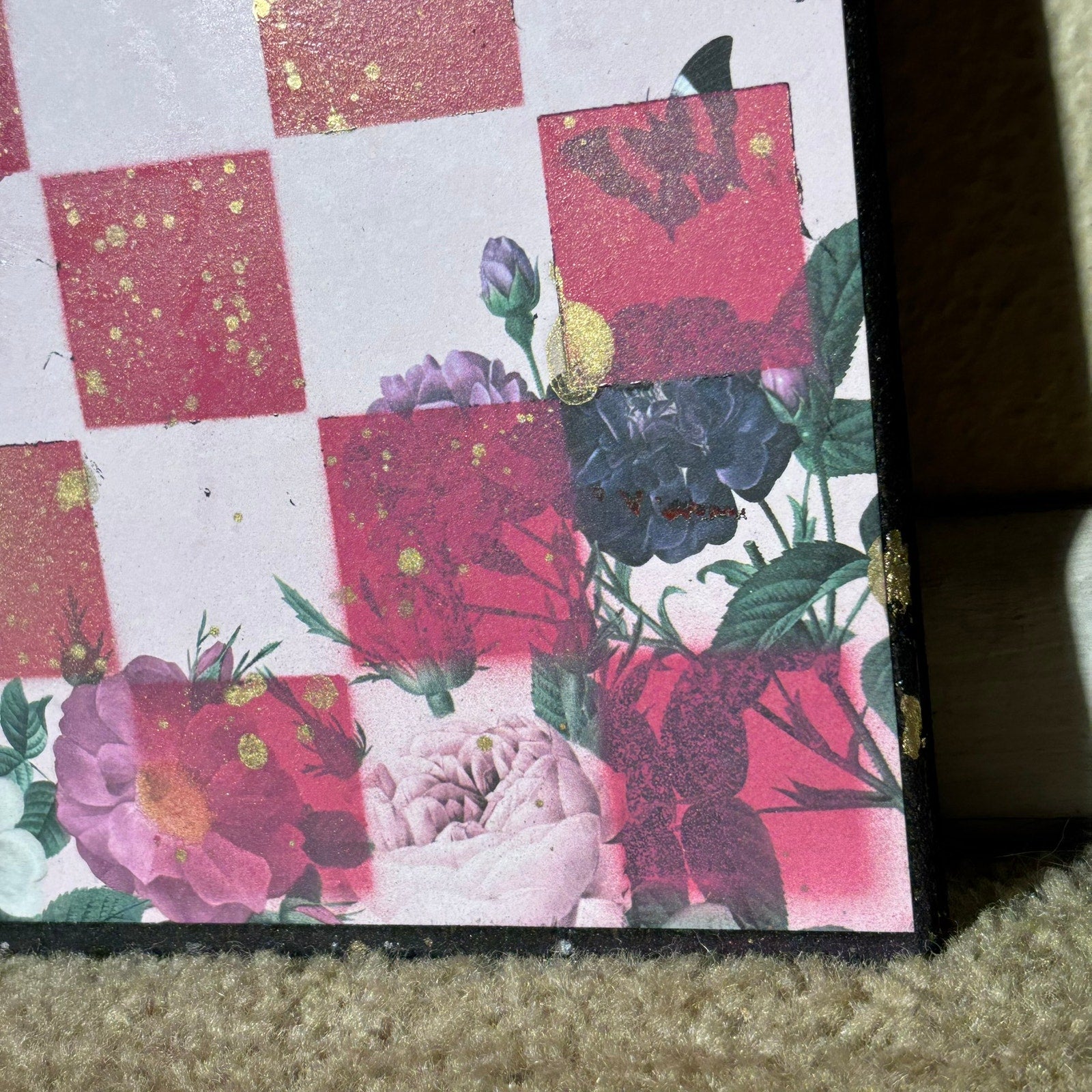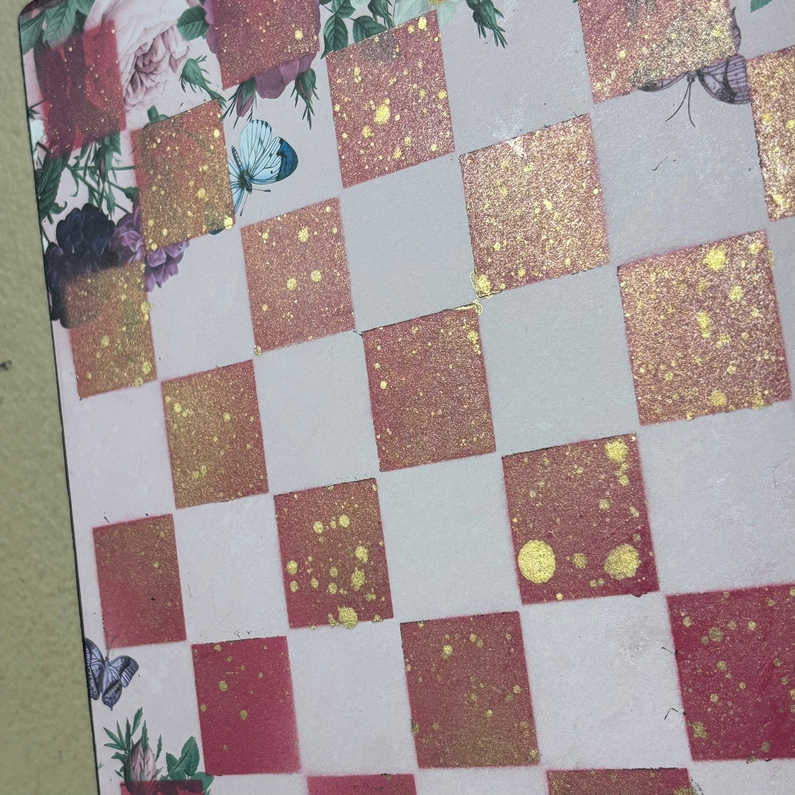 Each board features a layer of beautifully Scrapbook Paper Fused/Glued with particle board to give it a unique pretty pattern. We then paint squares onto the board to make them into fabulous chess boards. Made with a sturdy particle board base and smooth, beveled edges, this board is stunning.