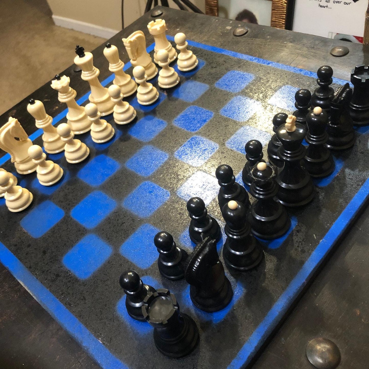 Introducing our exclusive Handcrafted Painted Particle Board Chess Set, meticulously designed with precision and care. Measuring 16 inches by 16 inches, this chess set features a beautifully painted piece of particle board that doubles as a work of art. Each set is a unique, one-of-a-kind creation, crafted by hand to ensure that no two sets are alike. Elevate your gaming experience with this exceptional chess set that combines vibrant design with the touch of artisan craftsmanship.