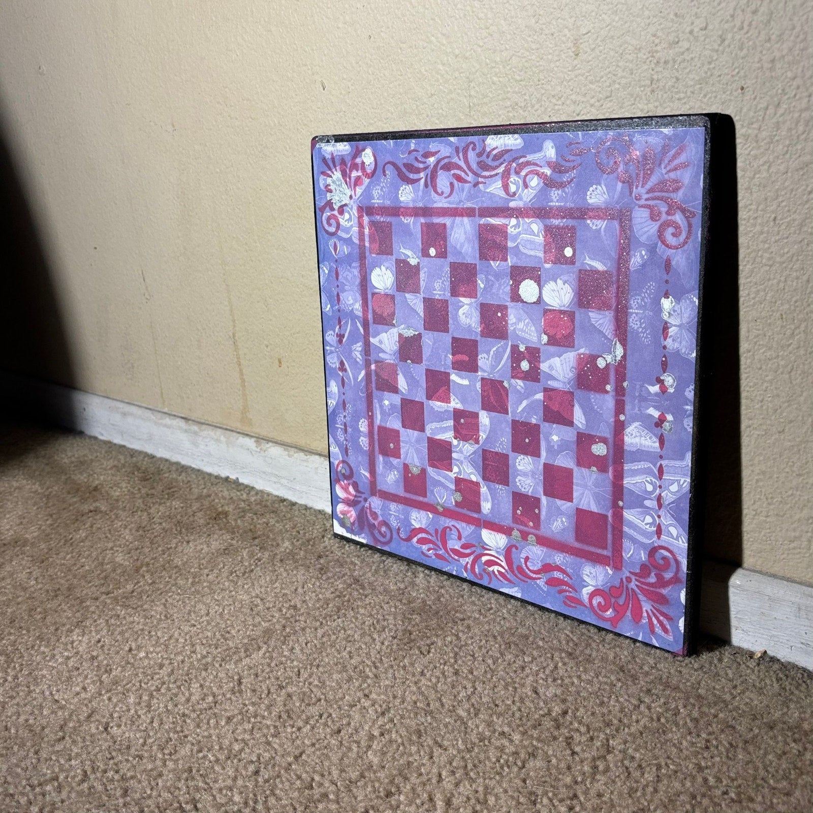 Each board features a layer of beautifully Scrapbook Paper Fused/Glued with particle board to give it a unique pretty pattern. We then paint squares onto the board to make them into fabulous chess boards. Made with a sturdy particle board base and smooth, beveled edges, this board is stunning.