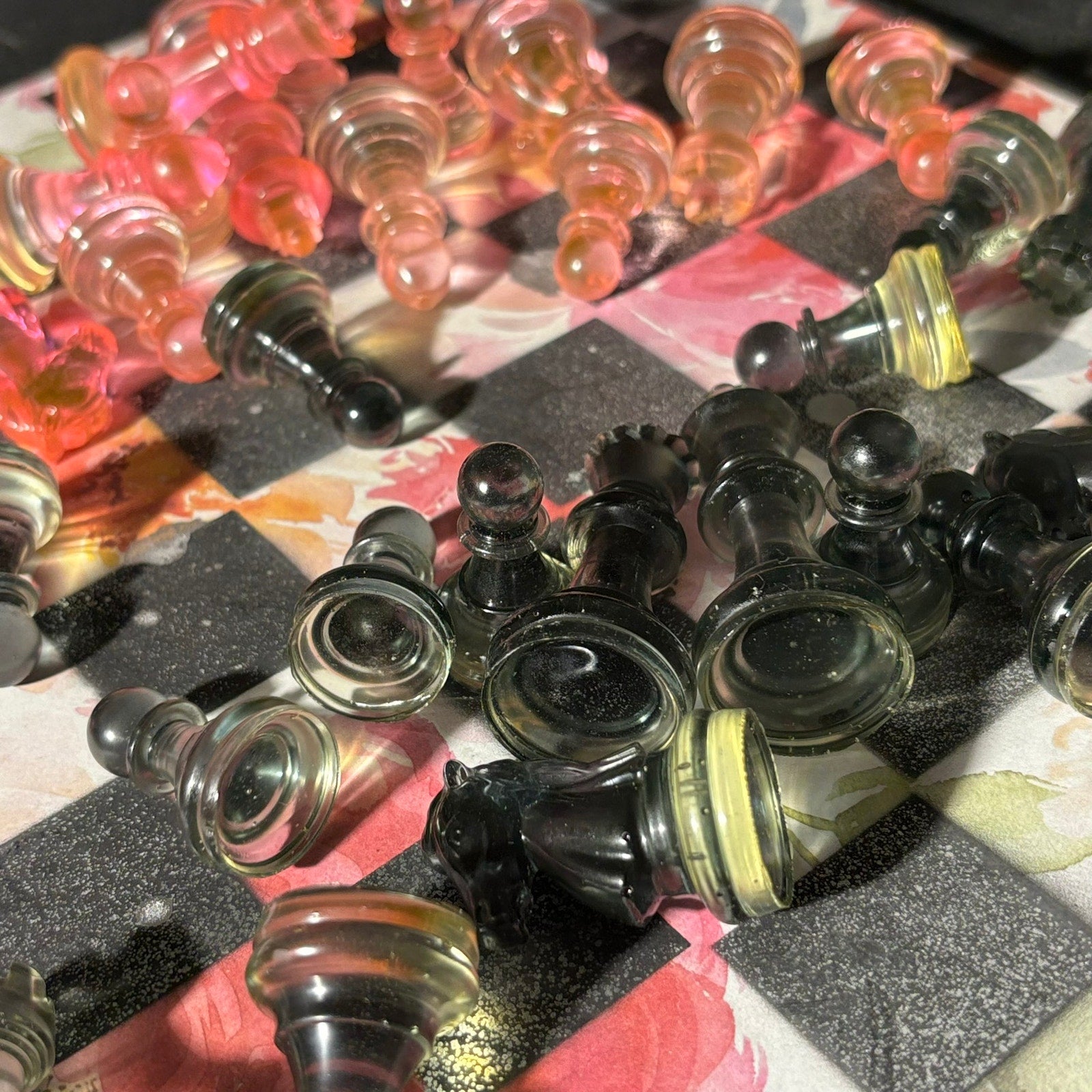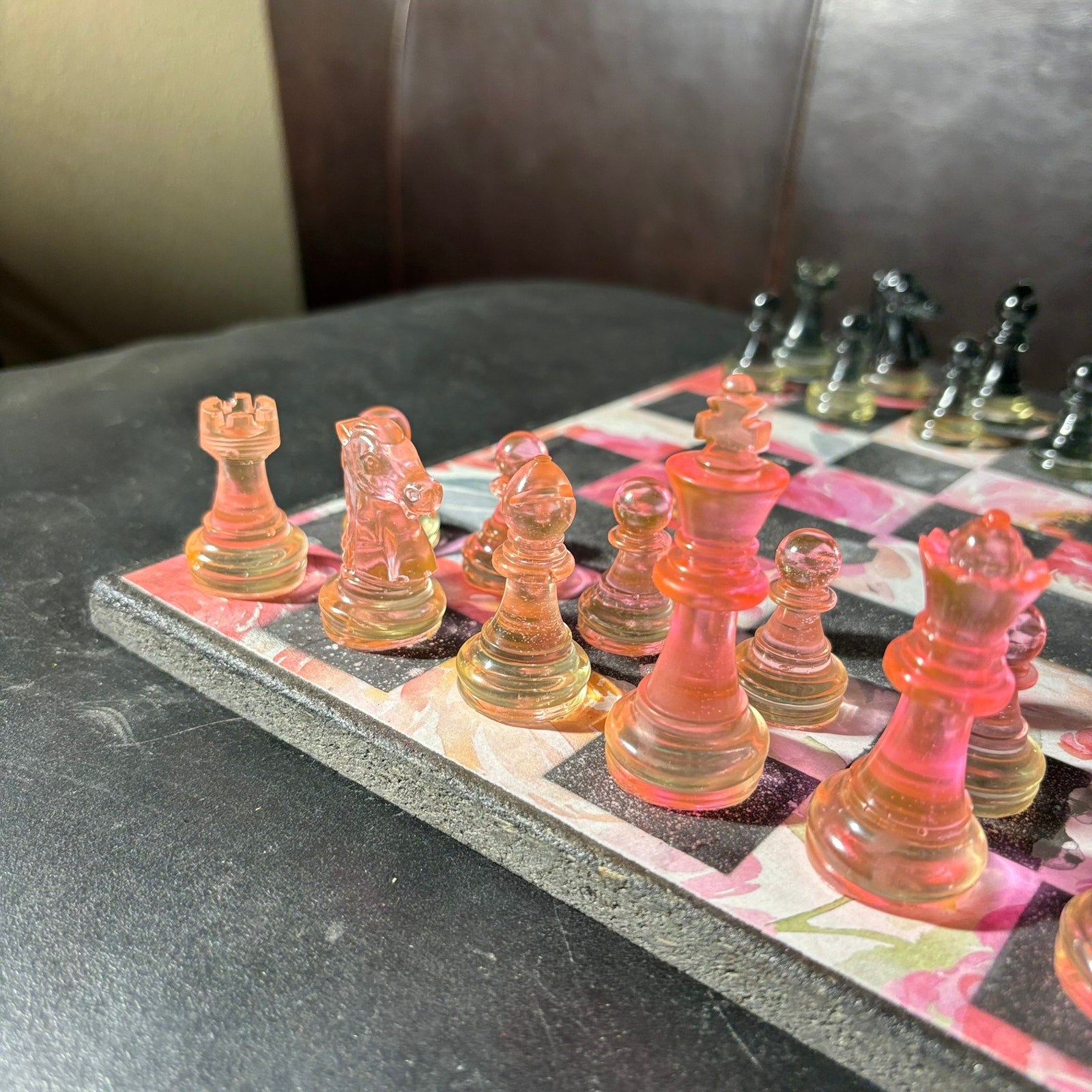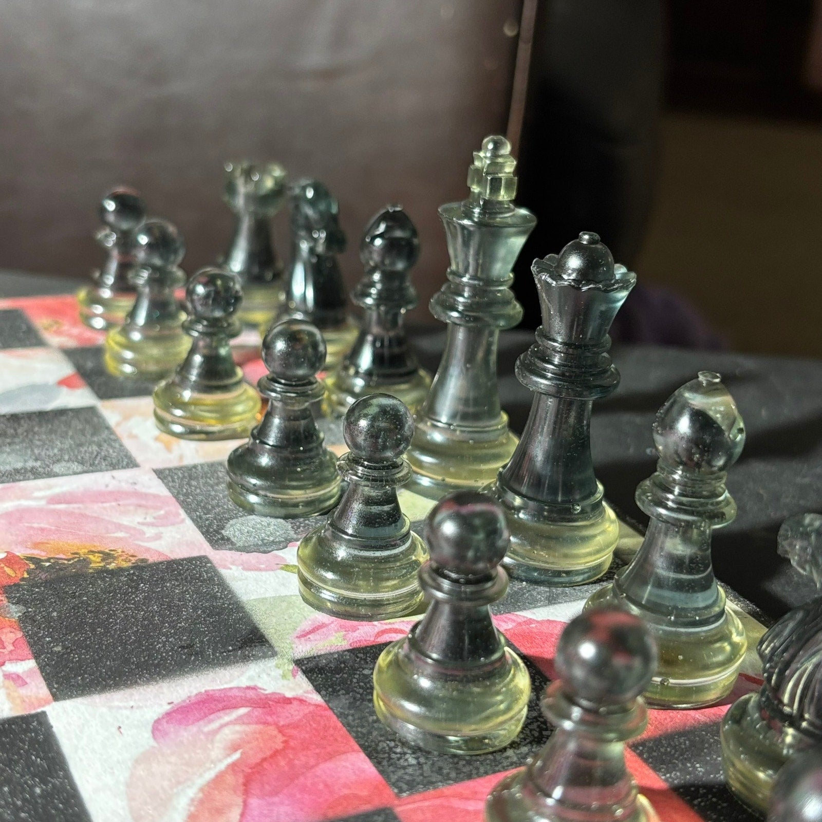 *** PLEASE READ: The resin pieces that have clear transparent parts will slowly turn royal amber as time goes on (Clear see through resin turn amber with time). Most of the sets are solid or colored so there is no need to expect a change at all, but some have clear transparent bottoms that will turn amber. I write this because some of our chess sets may not sell for a year or two and the photos are taken when the item is listed online. Meaning the photos will have slight difference. Rest assured, the amber is beautiful and vintage!