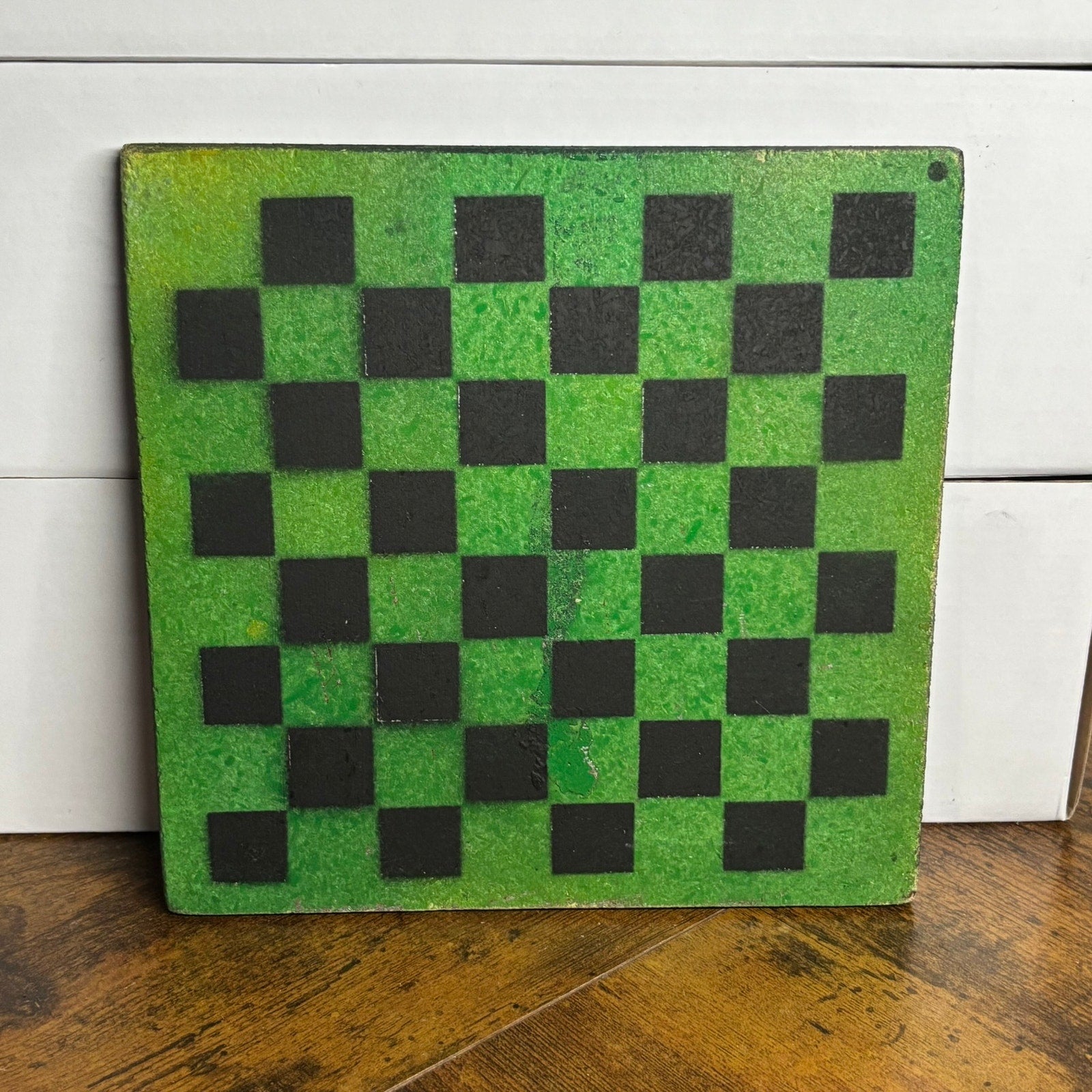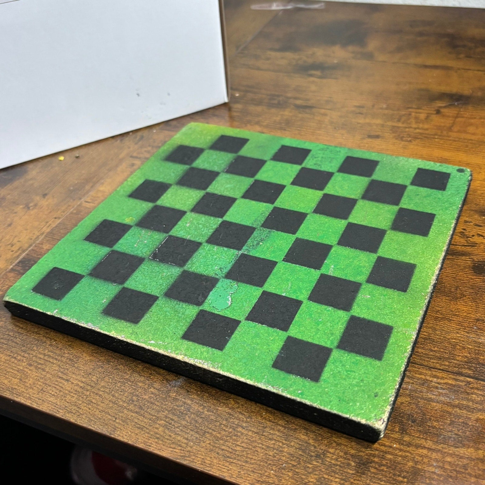 This is a one-of-a-kind, hand-painted chess board that will add a touch of artistry to your game. These are spray painted particle boards and have a double side. One side is painted and the backside is lined with scrapbook paper and has a different design. (The Scrapbook paper part is not meant to be played on but you can!)