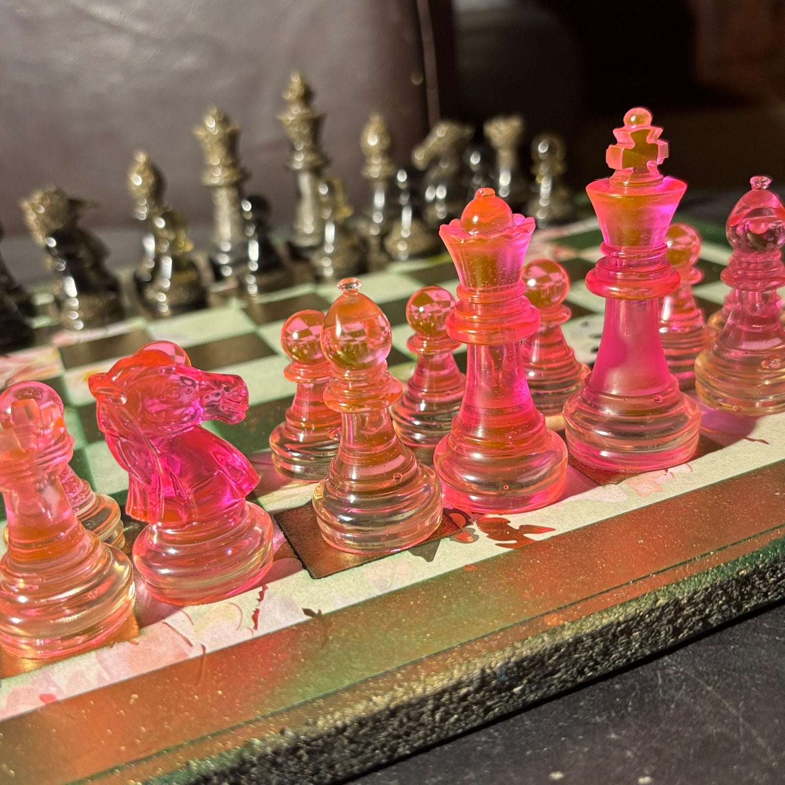 *** PLEASE READ: The resin pieces that have clear transparent parts will slowly turn royal amber as time goes on (Clear see through resin turn amber with time). Most of the sets are solid or colored so there is no need to expect a change at all, but some have clear transparent bottoms that will turn amber. I write this because some of our chess sets may not sell for a year or two and the photos are taken when the item is listed online. Meaning the photos will have slight difference. Rest assured, the amber is beautiful and vintage!