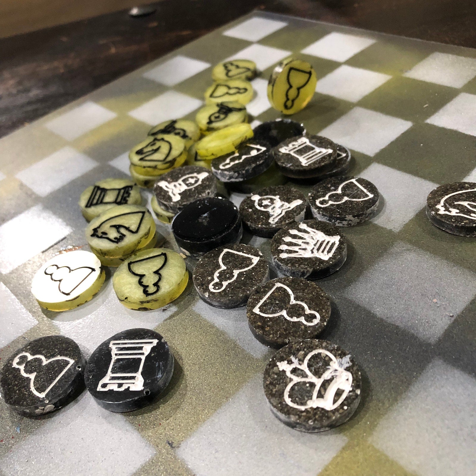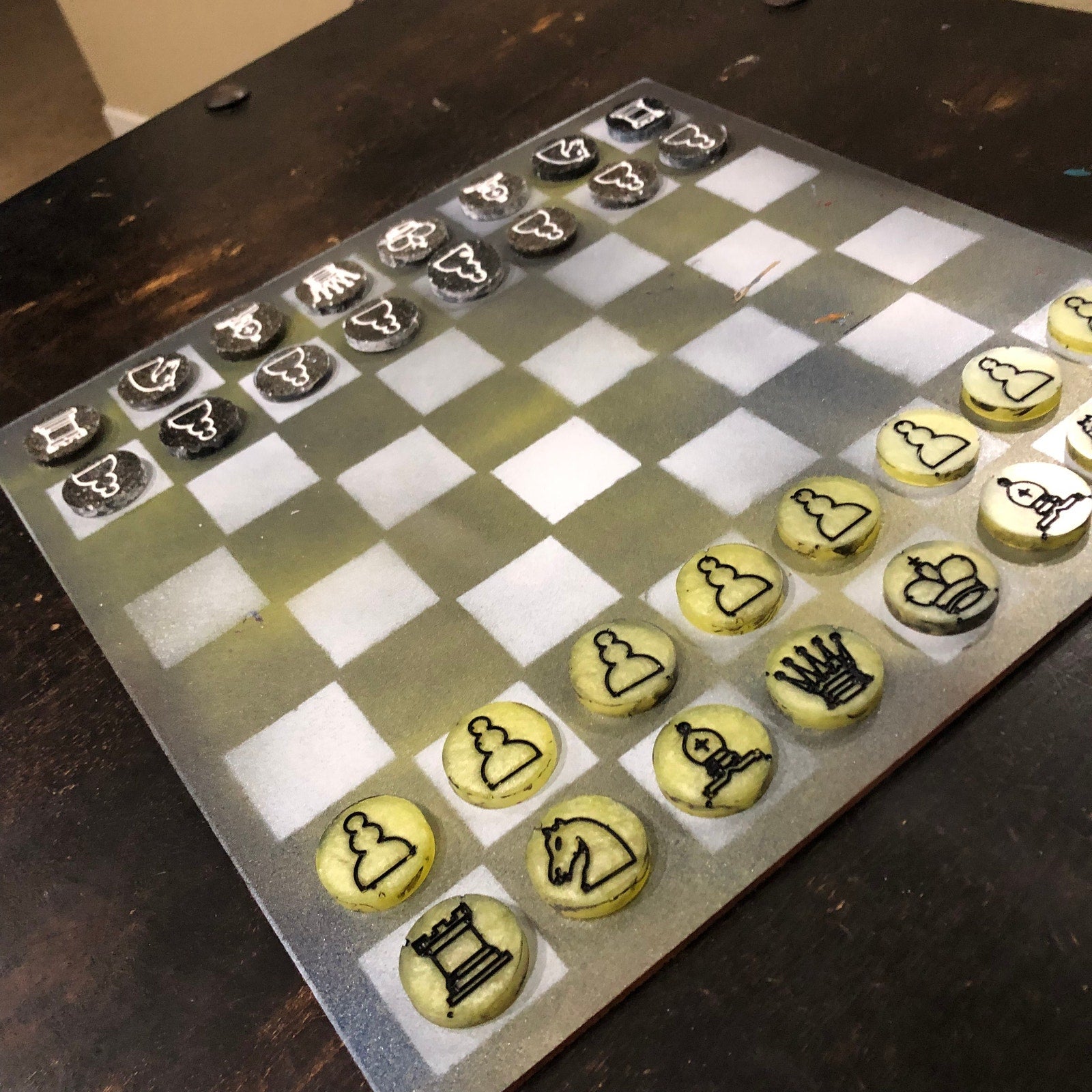 Introducing our exclusive Handcrafted Hardboard Chess Set, meticulously designed with precision and care. Measuring 12 inches by 12 inches, this chess set features a beautifully painted hardwood board that doubles as a work of art. Each set is a unique, one-of-a-kind creation, crafted by hand to ensure that no two sets are alike. Elevate your gaming experience with this exceptional chess set that combines vibrant design with the touch of artisan craftsmanship.