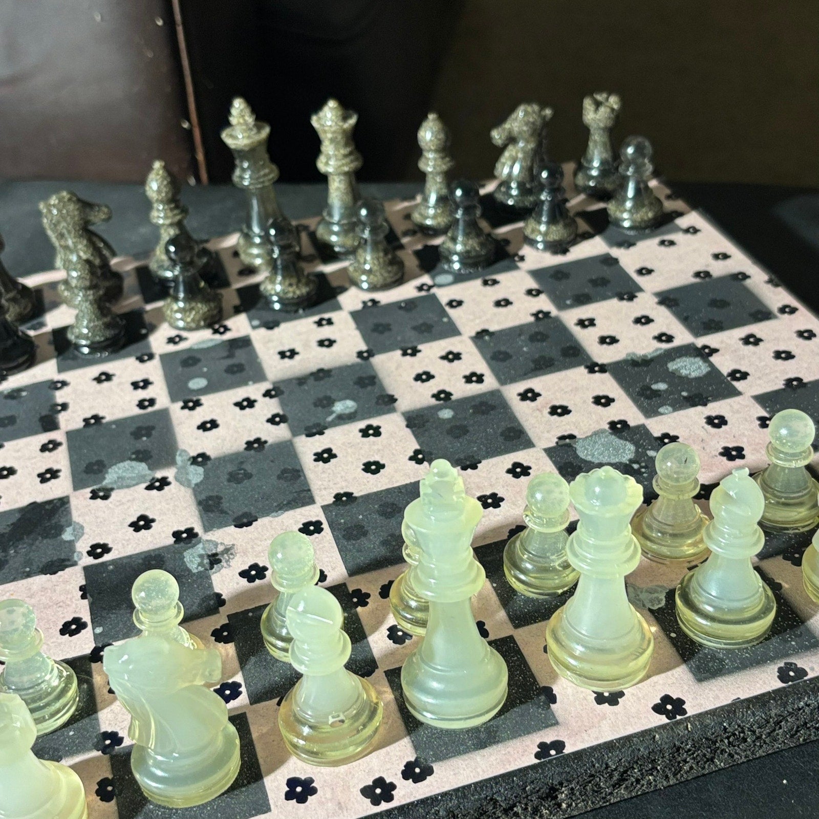 *** PLEASE READ: The resin pieces that have clear transparent parts will slowly turn royal amber as time goes on (Clear see through resin turn amber with time). Most of the sets are solid or colored so there is no need to expect a change at all, but some have clear transparent bottoms that will turn amber. I write this because some of our chess sets may not sell for a year or two and the photos are taken when the item is listed online. Meaning the photos will have slight difference. Rest assured, the amber is beautiful and vintage!