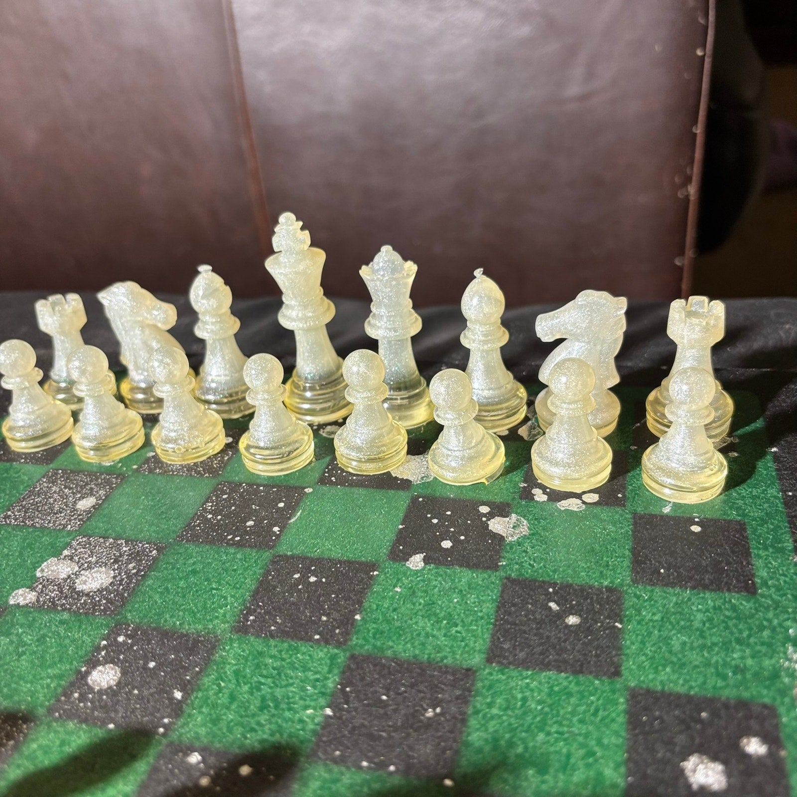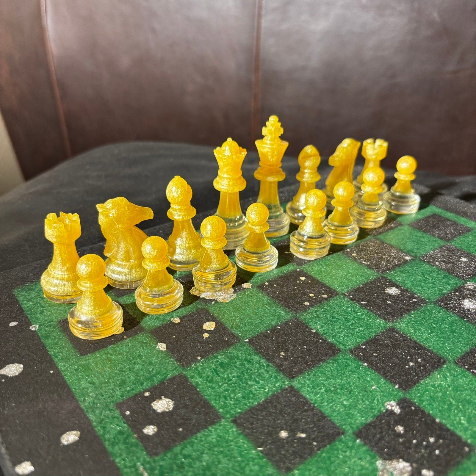 *** PLEASE READ: The resin pieces that have clear transparent parts will slowly turn royal amber as time goes on (Clear see through resin turn amber with time). Most of the sets are solid or colored so there is no need to expect a change at all, but some have clear transparent bottoms that will turn amber. I write this because some of our chess sets may not sell for a year or two and the photos are taken when the item is listed online. Meaning the photos will have slight difference. Rest assured, the amber is beautiful and vintage!