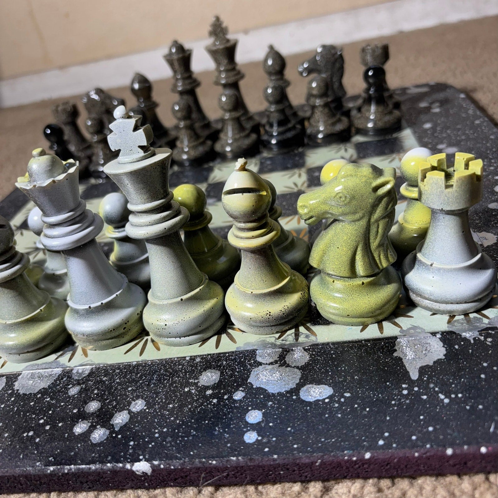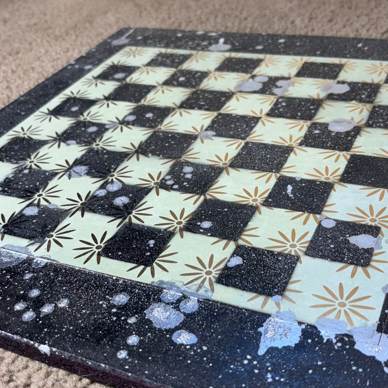 The chessboard is crafted from a 16x16 inch particle board, featuring a 12x12 inch scrapbook paper playing area. Both the board and squares are hand-painted with care, making each set truly unique. Add a touch of artistry to your game night with this beautiful chess set!
