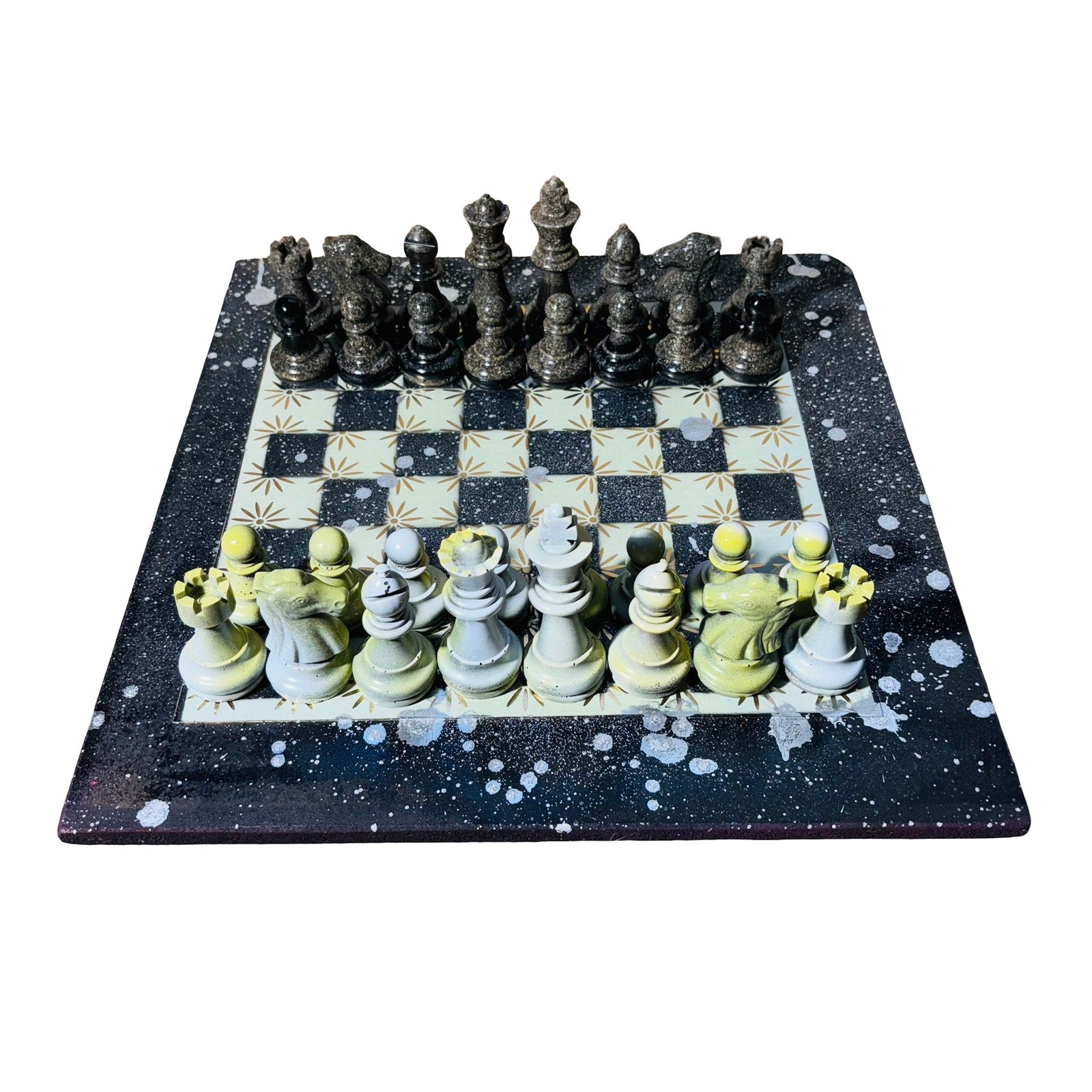 This unique chess set is a one-of-a-kind creation, perfect for chess enthusiasts and collectors! The chess pieces are handmade from resin and mixed with sand rock, giving them a substantial and satisfying weight.