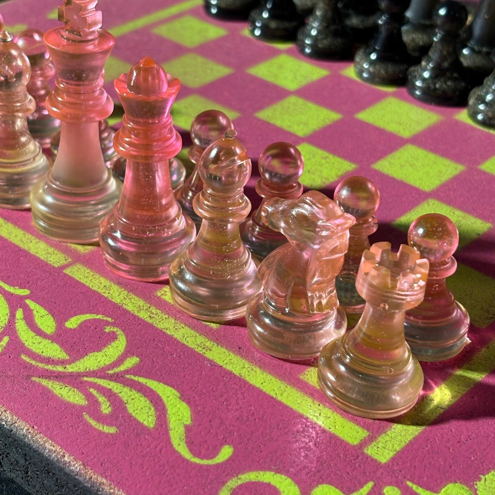 Introducing our exclusive Handcrafted Wooden Chess Set, meticulously designed with precision and care. Measuring 12 inches by 12 inches, this chess set features a beautifully painted Particle Board board that doubles as a work of art. Each set is a unique, one-of-a-kind creation, crafted by hand to ensure that no two sets are alike. Elevate your gaming experience with this exceptional chess set that combines vibrant design with the touch of artisan craftsmanship. This chess board comes with Resin chess pieces.