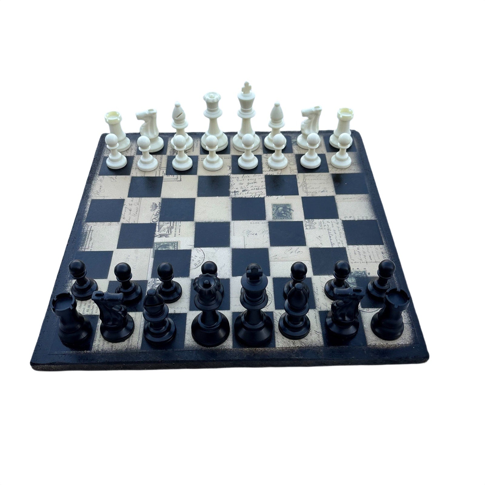 Introducing our exclusive Handcrafted Wooden Chess Set, meticulously designed with precision and care. Measuring 12 inches by 12 inches, this chess set features a beautifully painted particle board layered with a sheet of scrapbook paper board that doubles as a work of art. Each set is a unique, one-of-a-kind creation, crafted by hand to ensure that no two sets are alike. Elevate your gaming experience with this exceptional chess set that combines vibrant design with the touch of artisan craftsmanship. This chess board comes with chess pieces and is handcrafted as a one of one