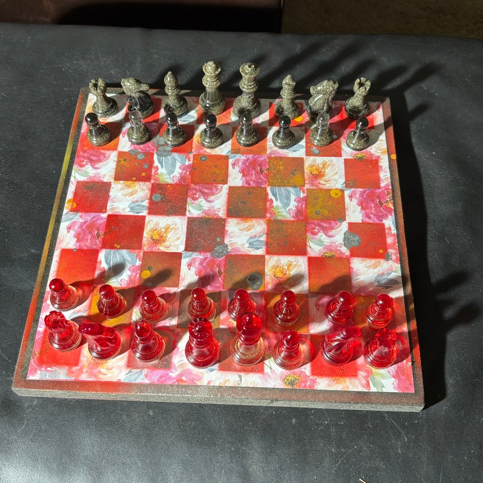 Introducing our exclusive Handcrafted Wooden Chess Set, meticulously designed with precision and care. Measuring 12 inches by 12 inches, this chess set features a beautifully painted particle board layered with a sheet of scrapbook paper board that doubles as a work of art. Each set is a unique, one-of-a-kind creation, crafted by hand to ensure that no two sets are alike. Elevate your gaming experience with this exceptional chess set that combines vibrant design with the touch of artisan craftsmanship. This chess board comes with chess pieces and is handcrafted as a one of one