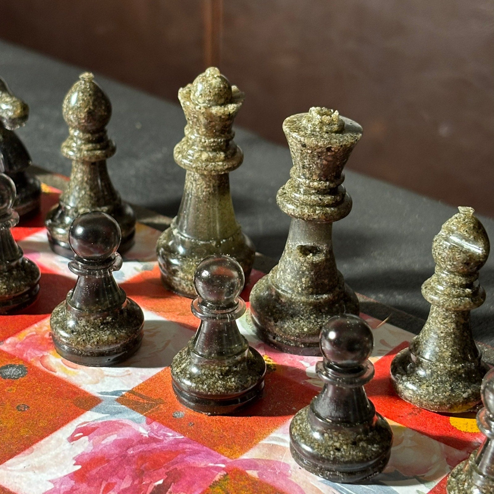 *** PLEASE READ: The resin pieces that have clear transparent parts will slowly turn royal amber as time goes on (Clear see through resin turn amber with time). Most of the sets are solid or colored so there is no need to expect a change at all, but some have clear transparent bottoms that will turn amber. I write this because some of our chess sets may not sell for a year or two and the photos are taken when the item is listed online. Meaning the photos will have slight difference. Rest assured, the amber is beautiful and vintage!