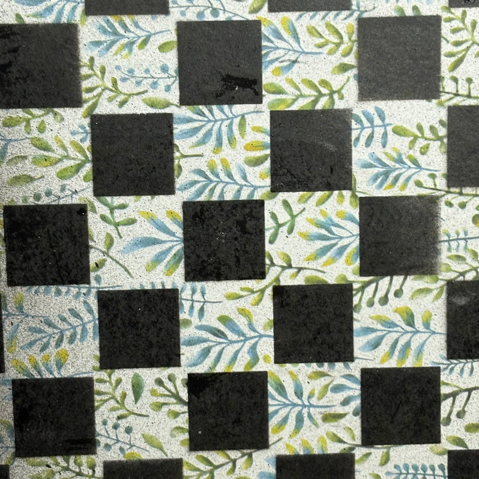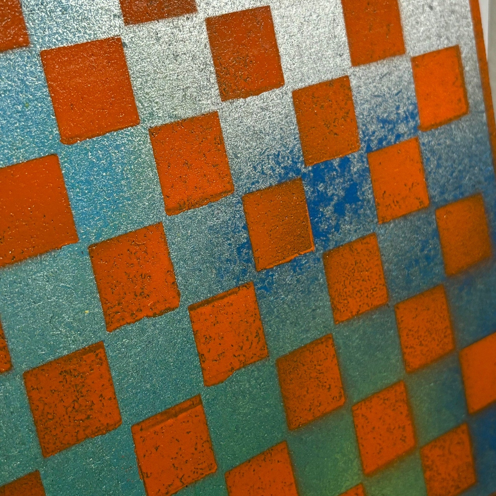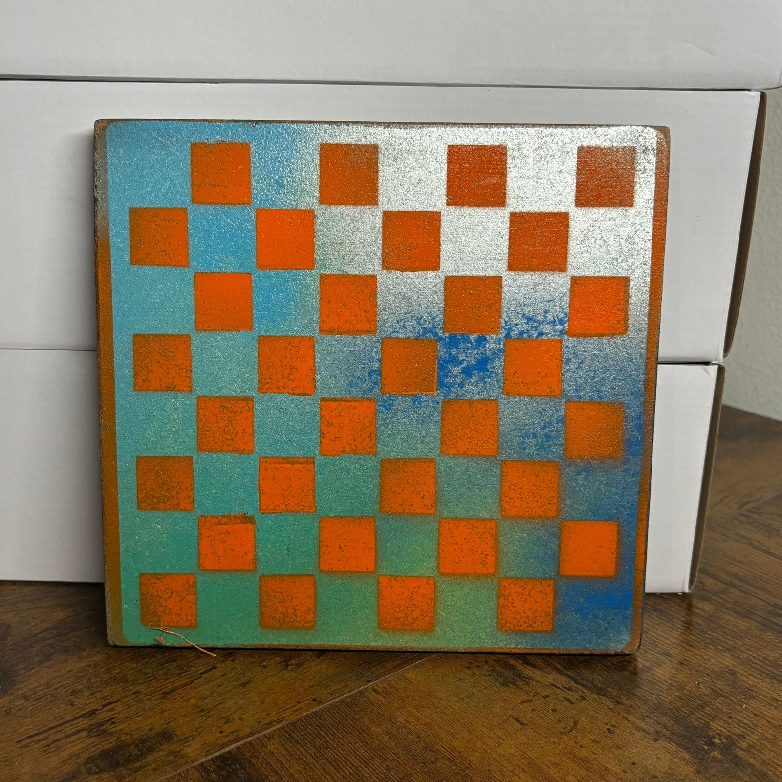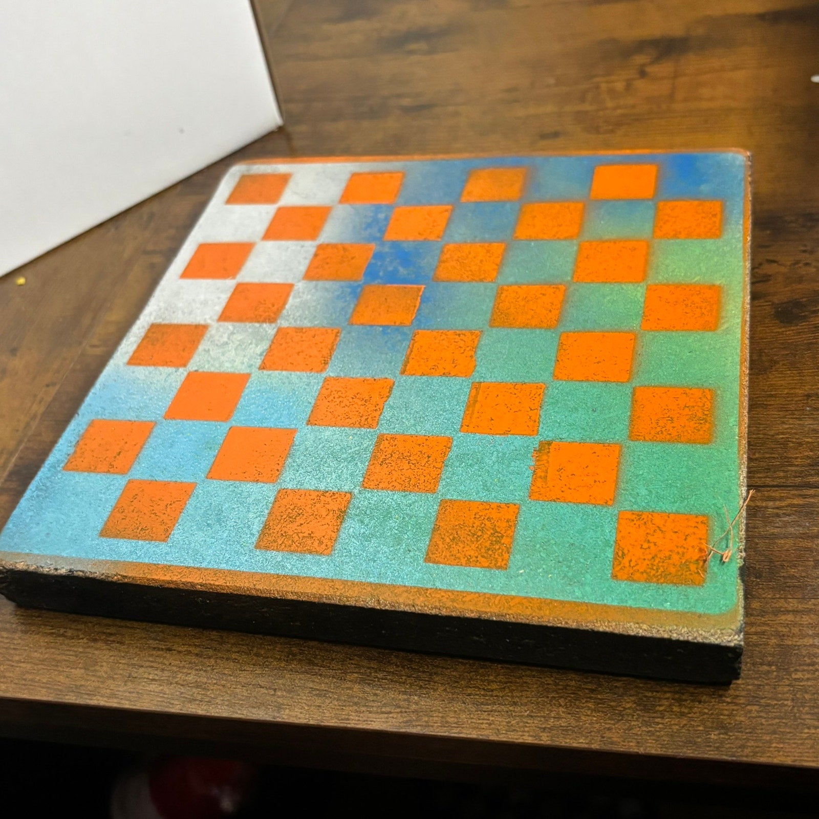 This is a one-of-a-kind, hand-painted chess board that will add a touch of artistry to your game. These are spray painted particle boards and have a double side. One side is painted and the backside is lined with scrapbook paper and has a different design. (The Scrapbook paper part is not meant to be played on but you can!)