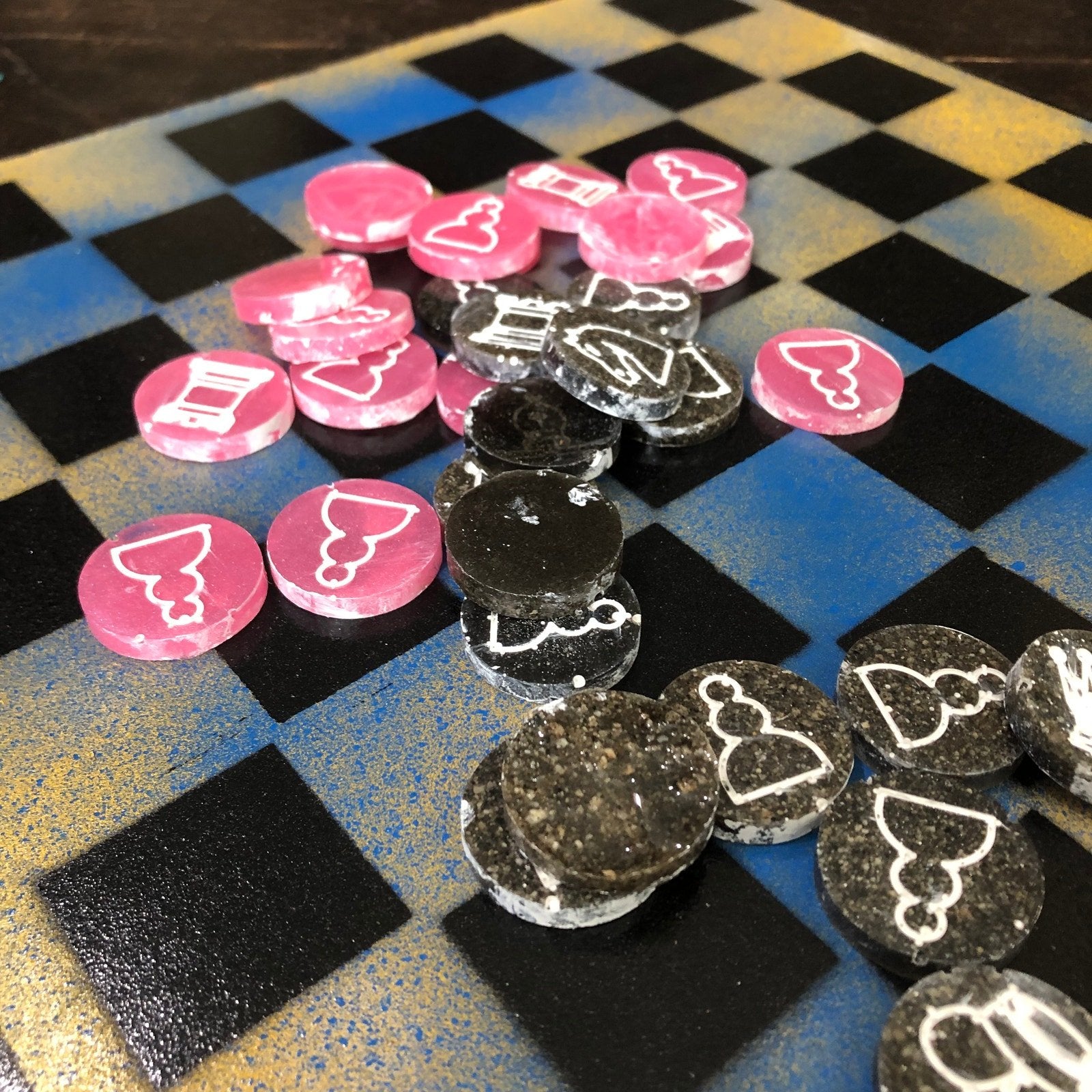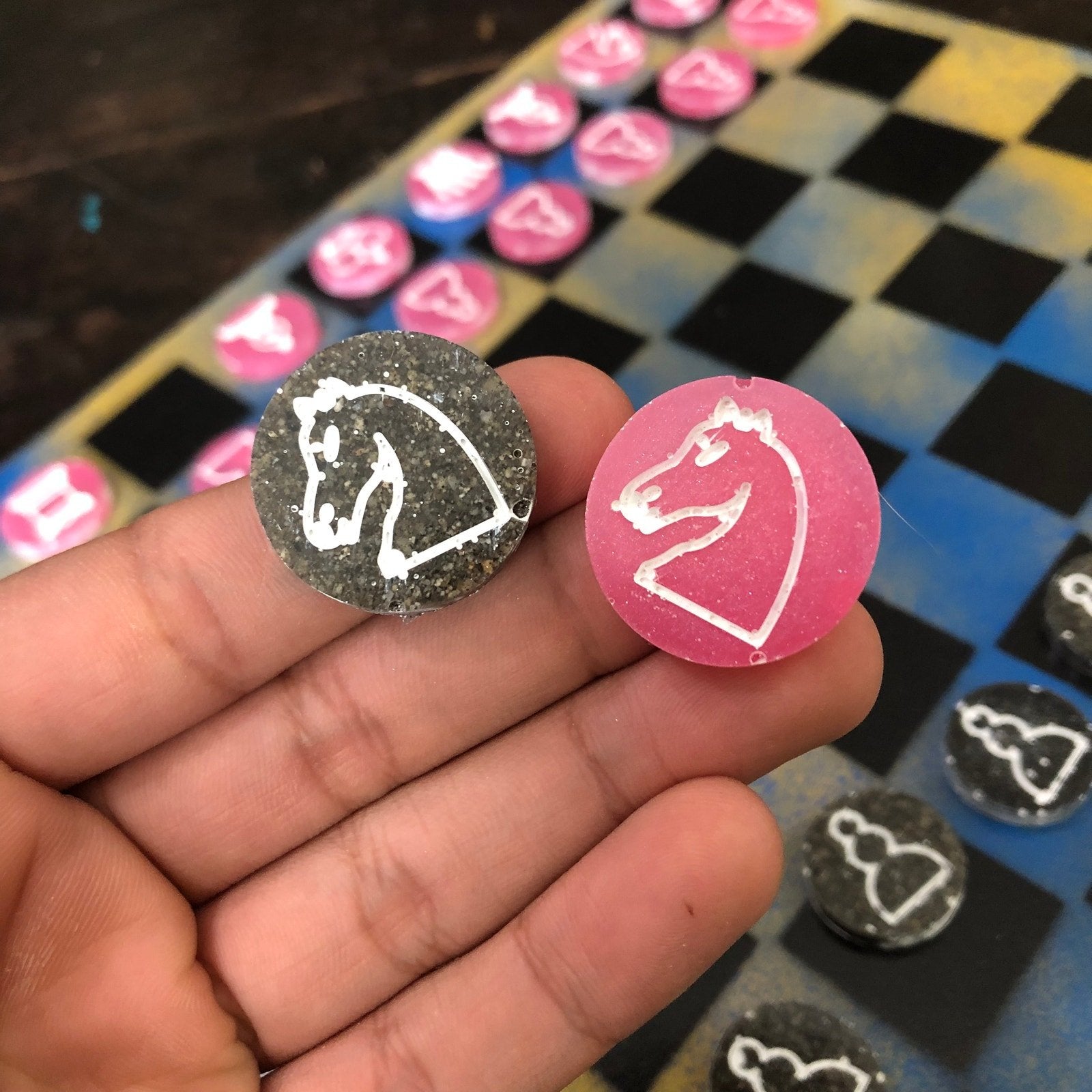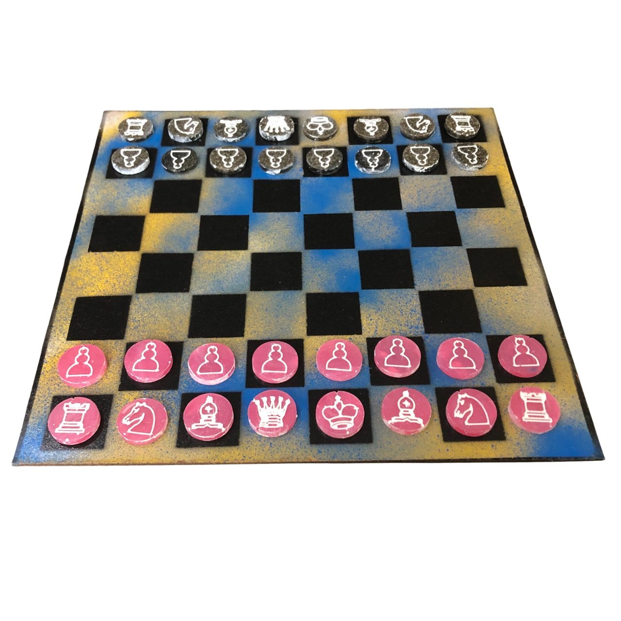 Painted Chess Set - Blu Yellow Mix (Pink Pieces)