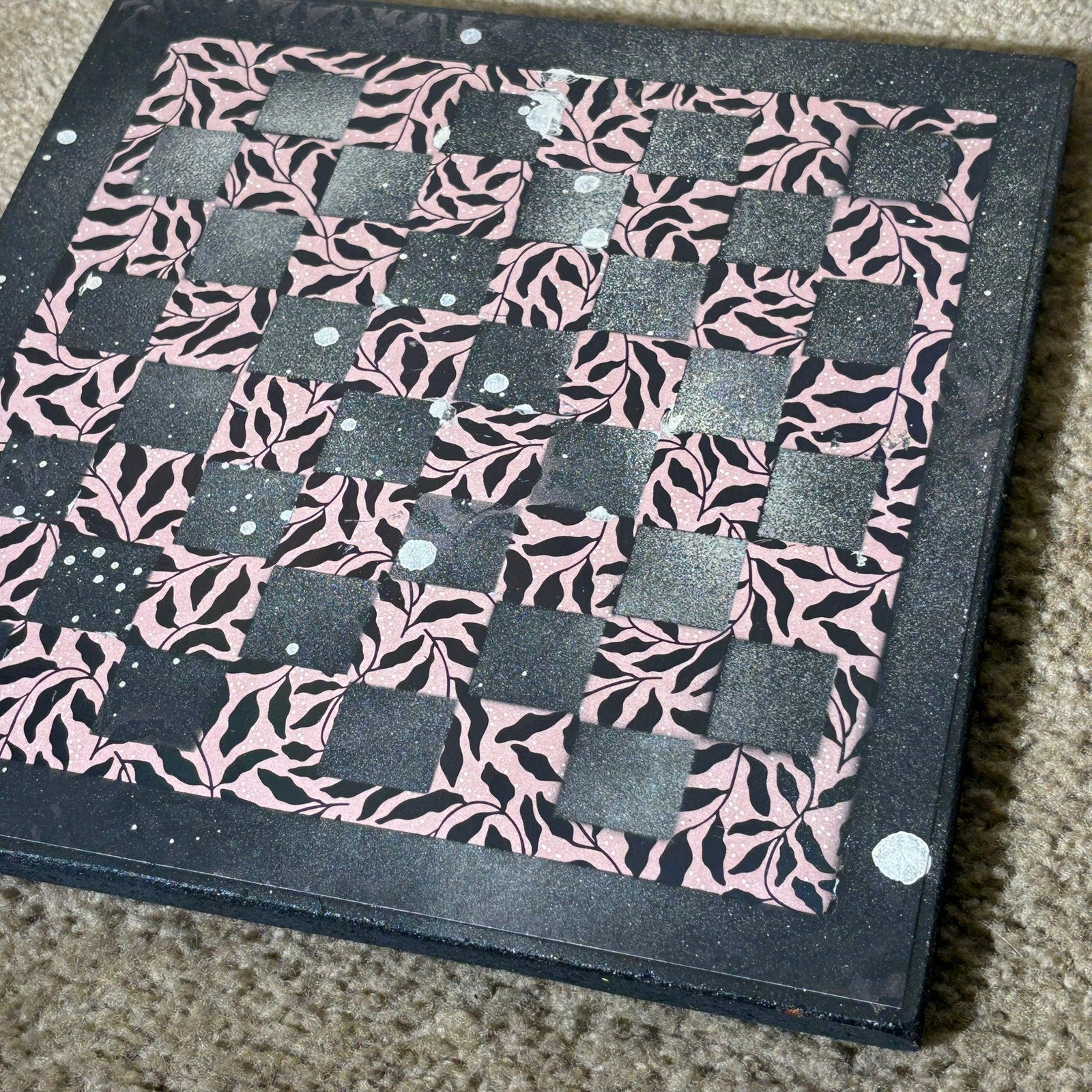 Each board features a layer of beautifully Scrapbook Paper Fused/Glued with particle board to give it a unique pretty pattern. We then paint squares onto the board to make them into fabulous chess boards. Made with a sturdy particle board base and smooth, beveled edges, this board is stunning.