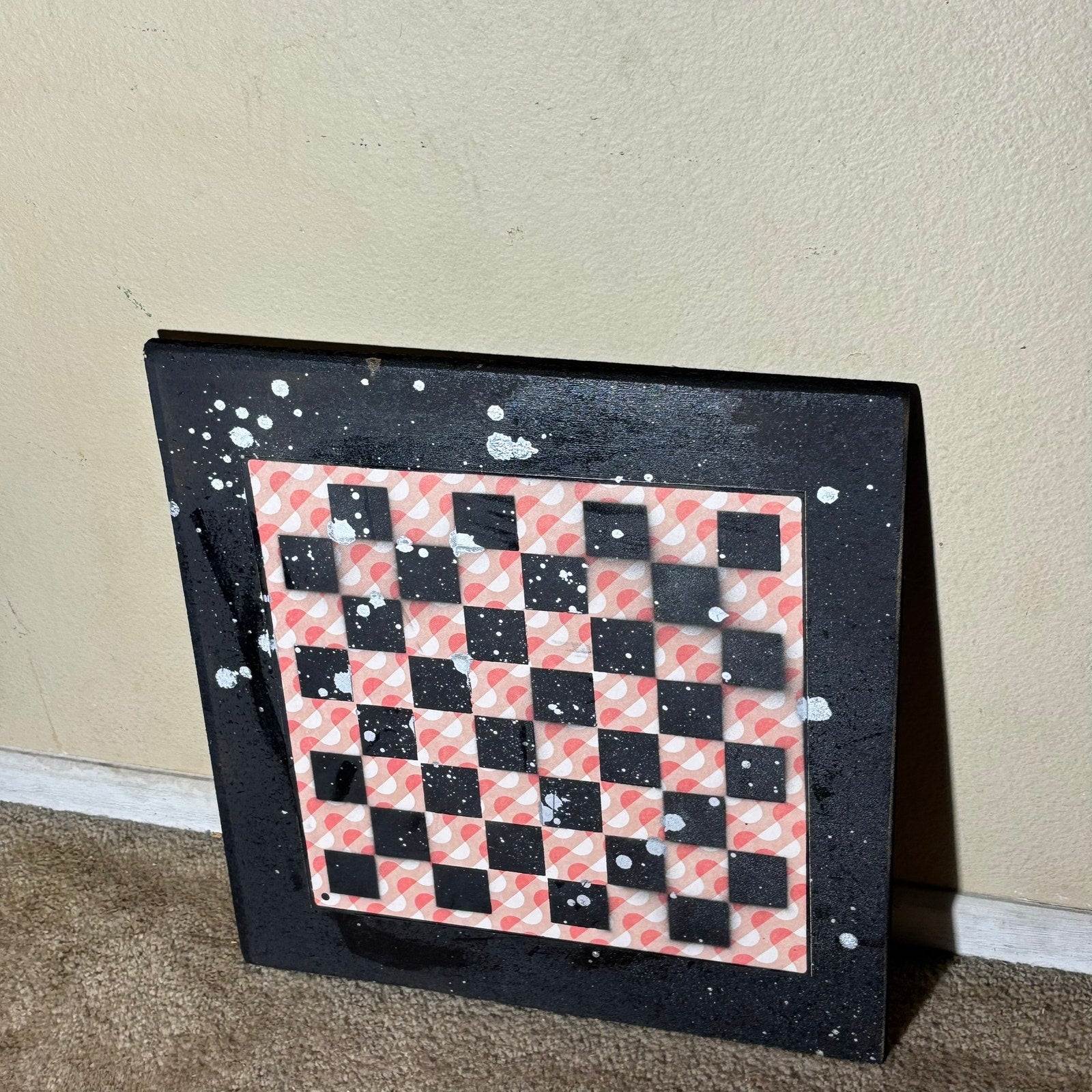 The board is crafted from durable particle board, painted with care to create the classic chess square pattern. What makes this board special is the unique 12x12 piece of scrapbook paper inlaid in the center, adding a personal touch to your game.