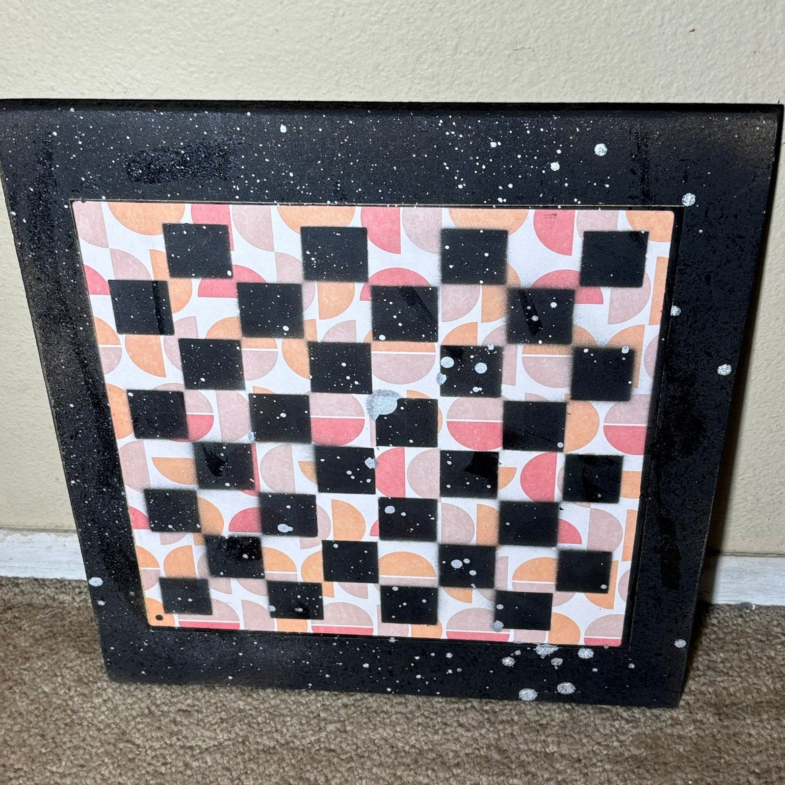 The board is crafted from durable particle board, painted with care to create the classic chess square pattern. What makes this board special is the unique 12x12 piece of scrapbook paper inlaid in the center, adding a personal touch to your game.