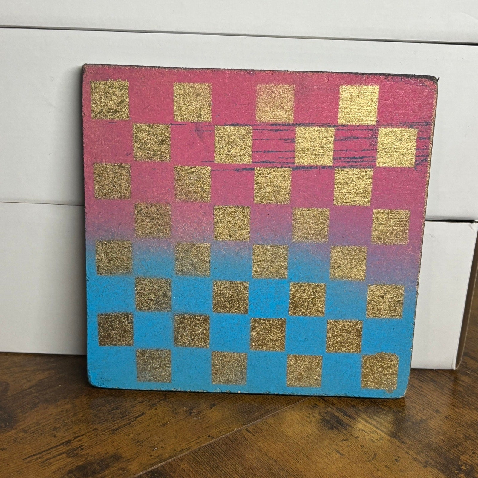 This is a one-of-a-kind, hand-painted chess board that will add a touch of artistry to your game. These are spray painted particle boards and have a double side. One side is painted and the backside is lined with scrapbook paper and has a different design. (The Scrapbook paper part is not meant to be played on but you can!)