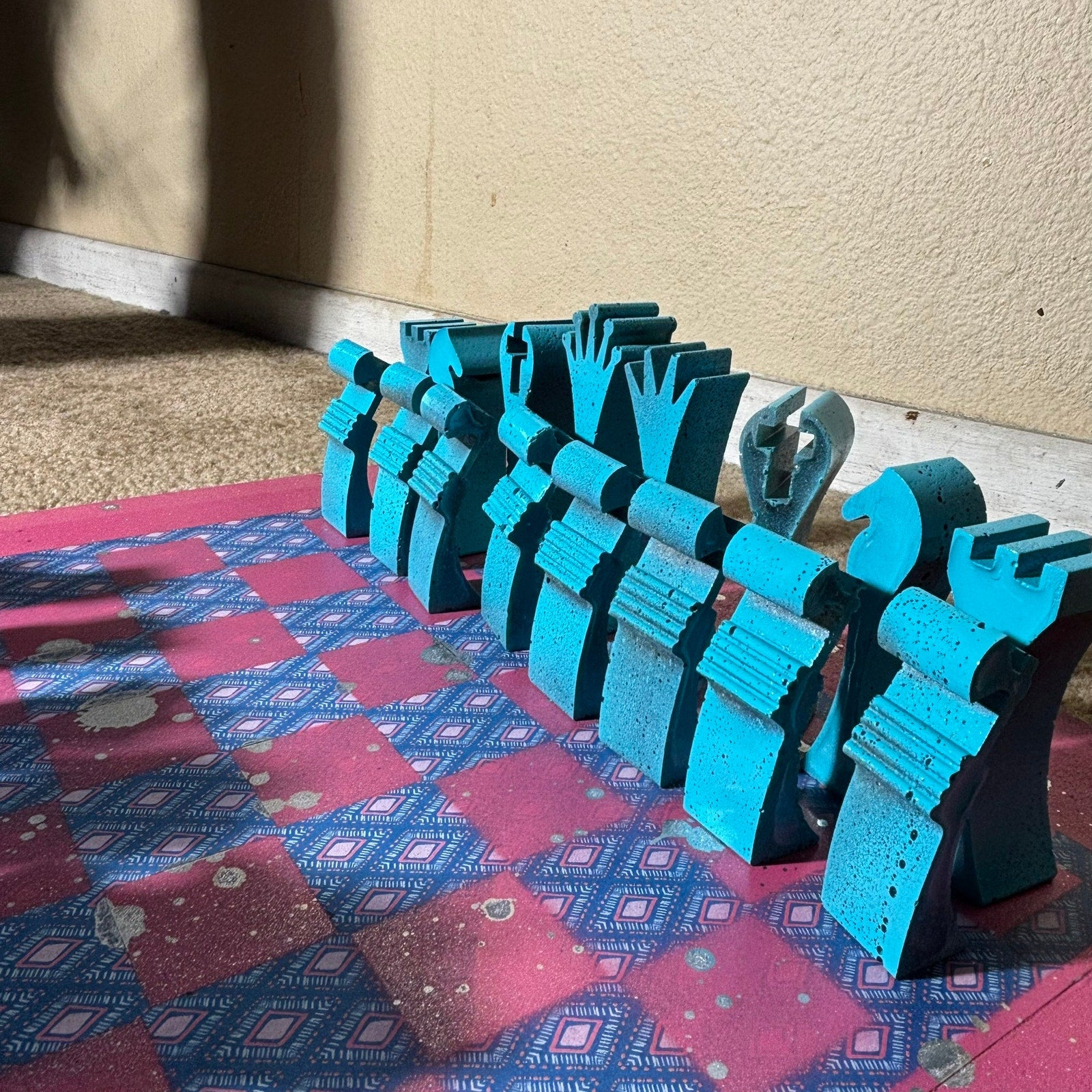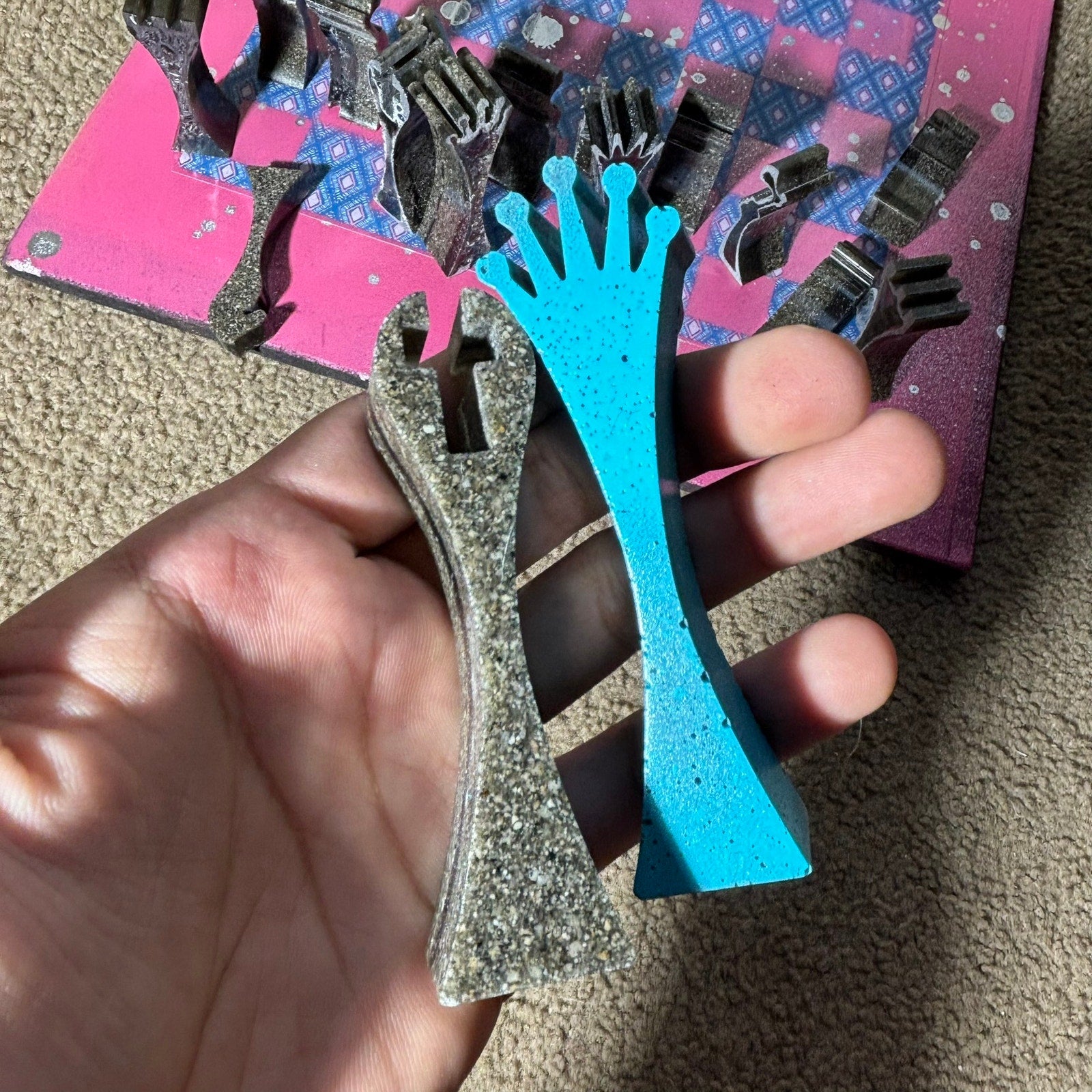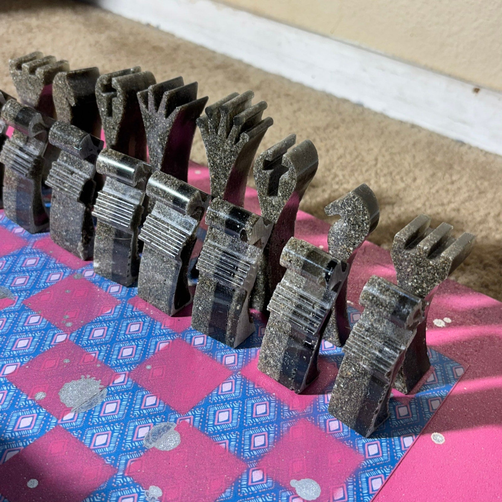 This unique chess set is a one-of-a-kind creation, perfect for chess enthusiasts and collectors! The chess pieces are handmade from resin and mixed with sand rock, giving them a substantial and satisfying weight.