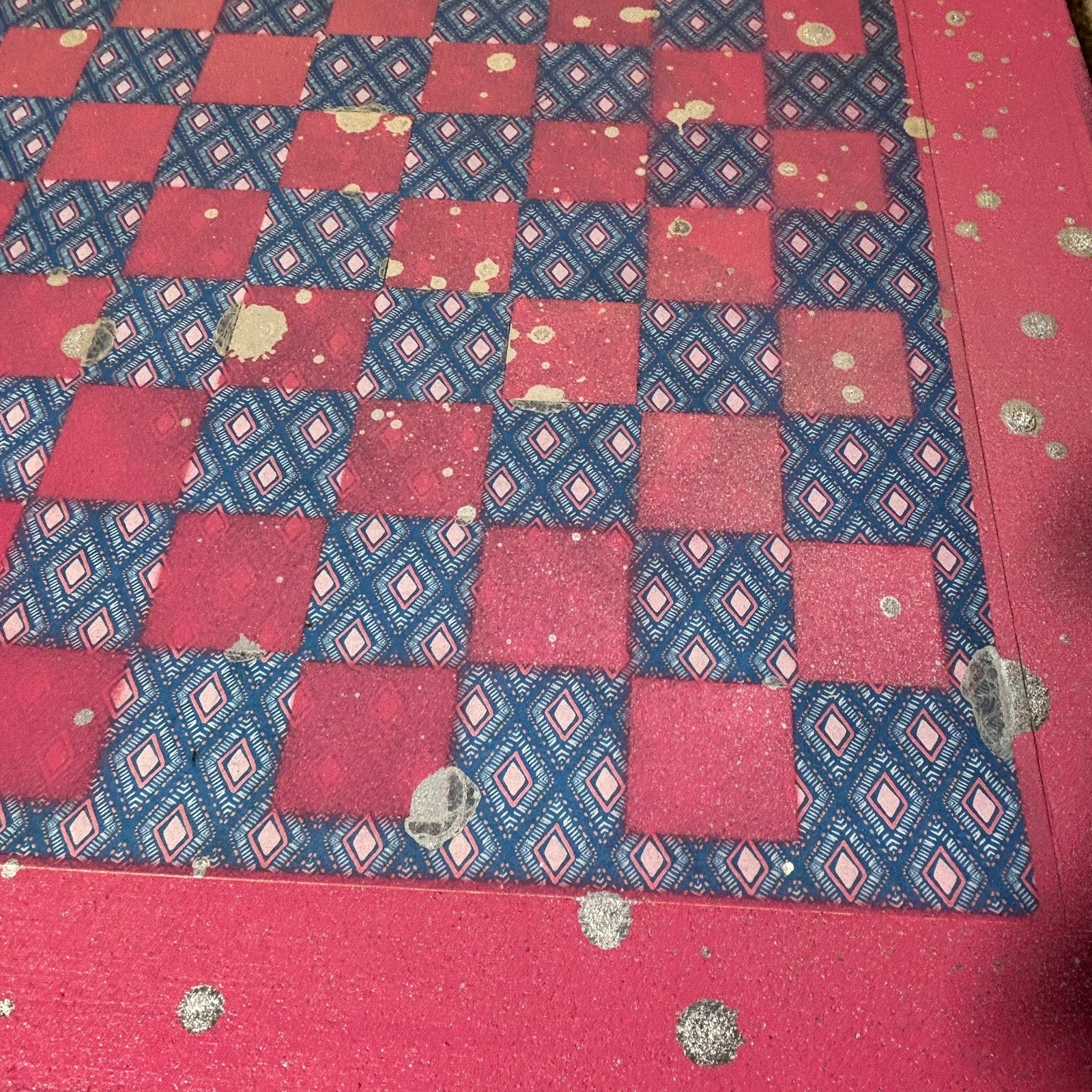 The chessboard is crafted from a 16x16 inch particle board, featuring a 12x12 inch scrapbook paper playing area. Both the board and squares are hand-painted with care, making each set truly unique. Add a touch of artistry to your game night with this beautiful chess set!