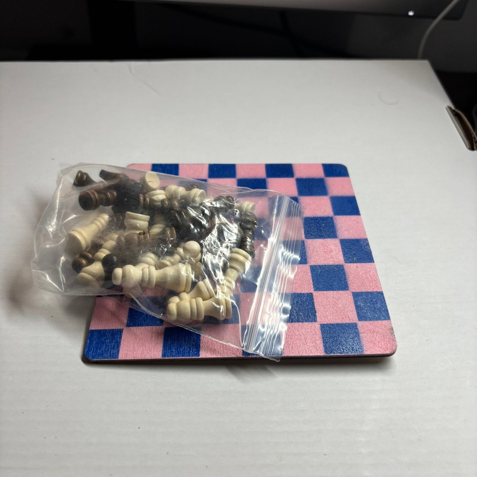 The board is made of a thin piece of wood and has been lovingly hand-painted, giving it a unique and charming touch. This chess set is perfect for collectors, travel enthusiasts, or anyone who appreciates a touch of whimsy.