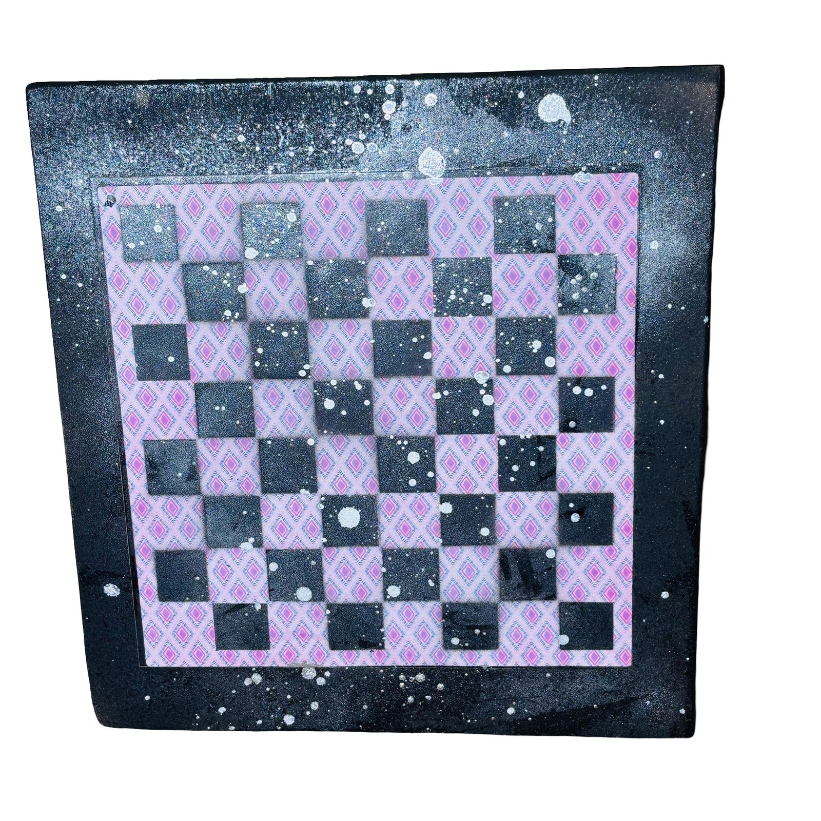 The board is crafted from durable particle board, painted with care to create the classic chess square pattern. What makes this board special is the unique 12x12 piece of scrapbook paper inlaid in the center, adding a personal touch to your game.