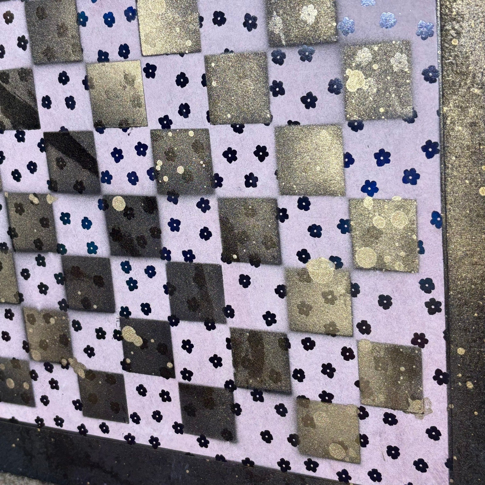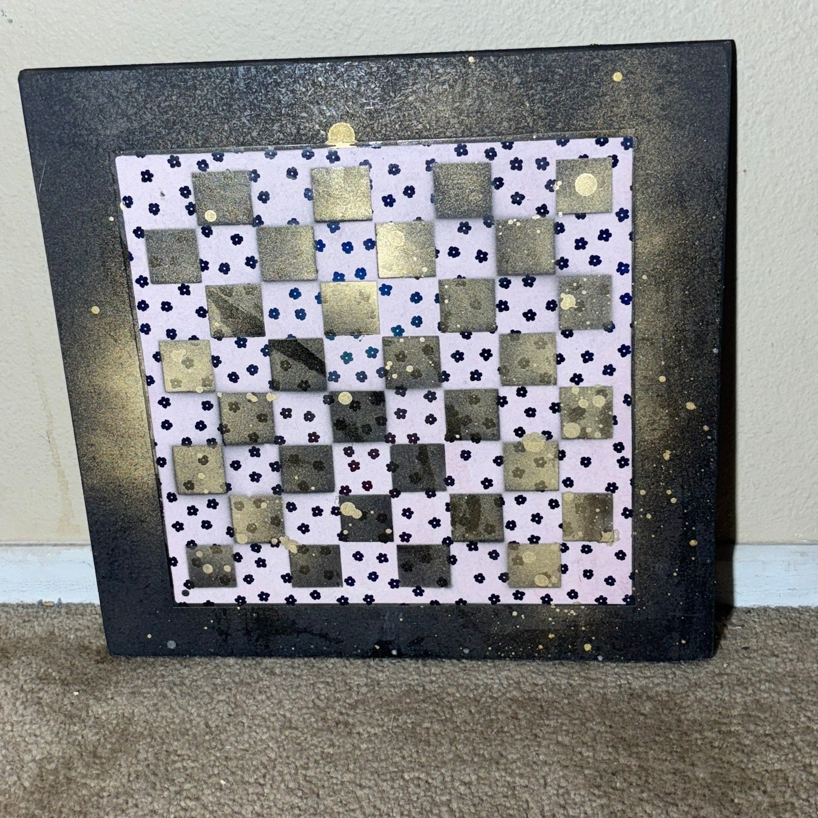 The board is crafted from durable particle board, painted with care to create the classic chess square pattern. What makes this board special is the unique 12x12 piece of scrapbook paper inlaid in the center, adding a personal touch to your game.