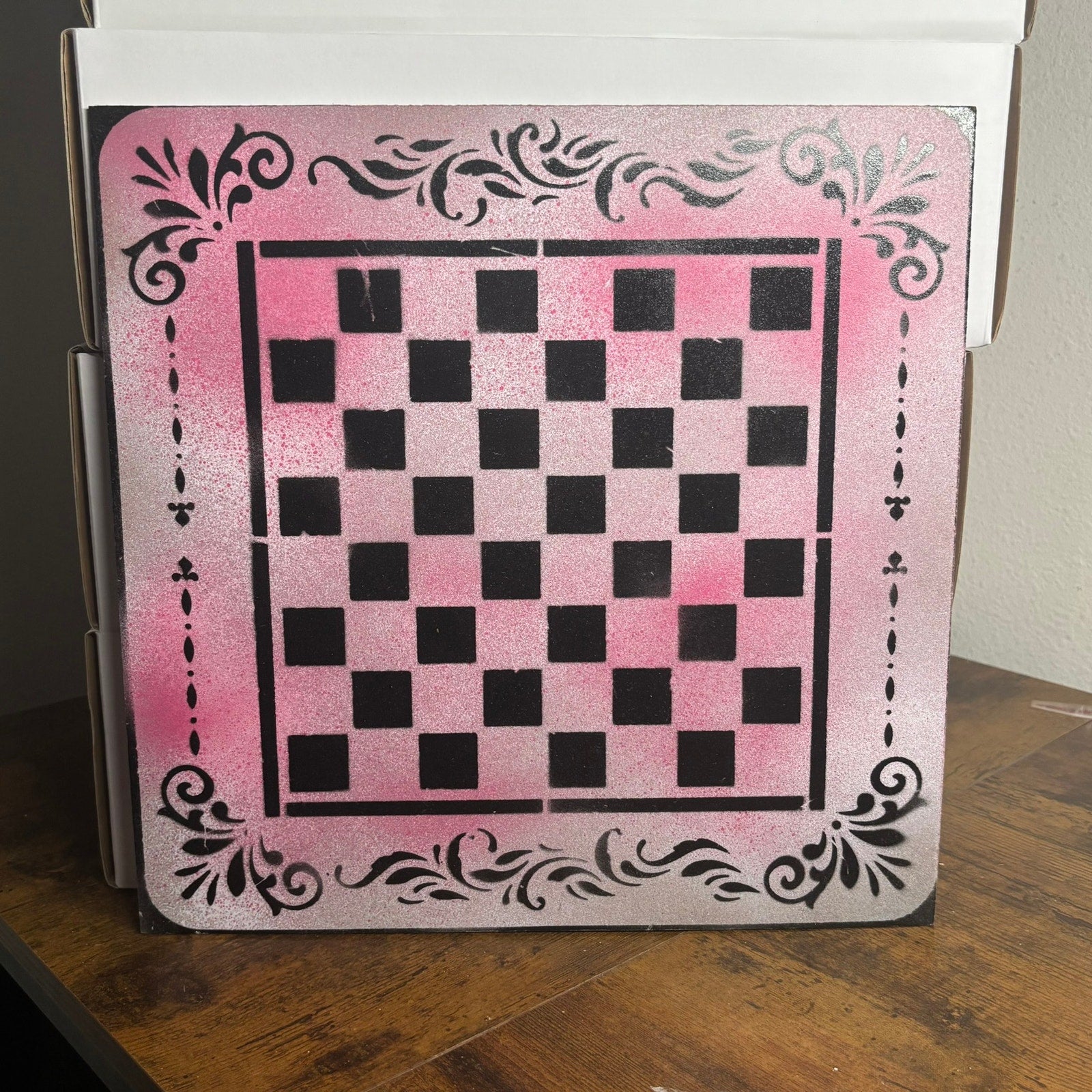Each board features a beautifully Painted Hardboard with a unique pretty pattern. We then paint squares onto the board to make them into fabulous chess boards.
