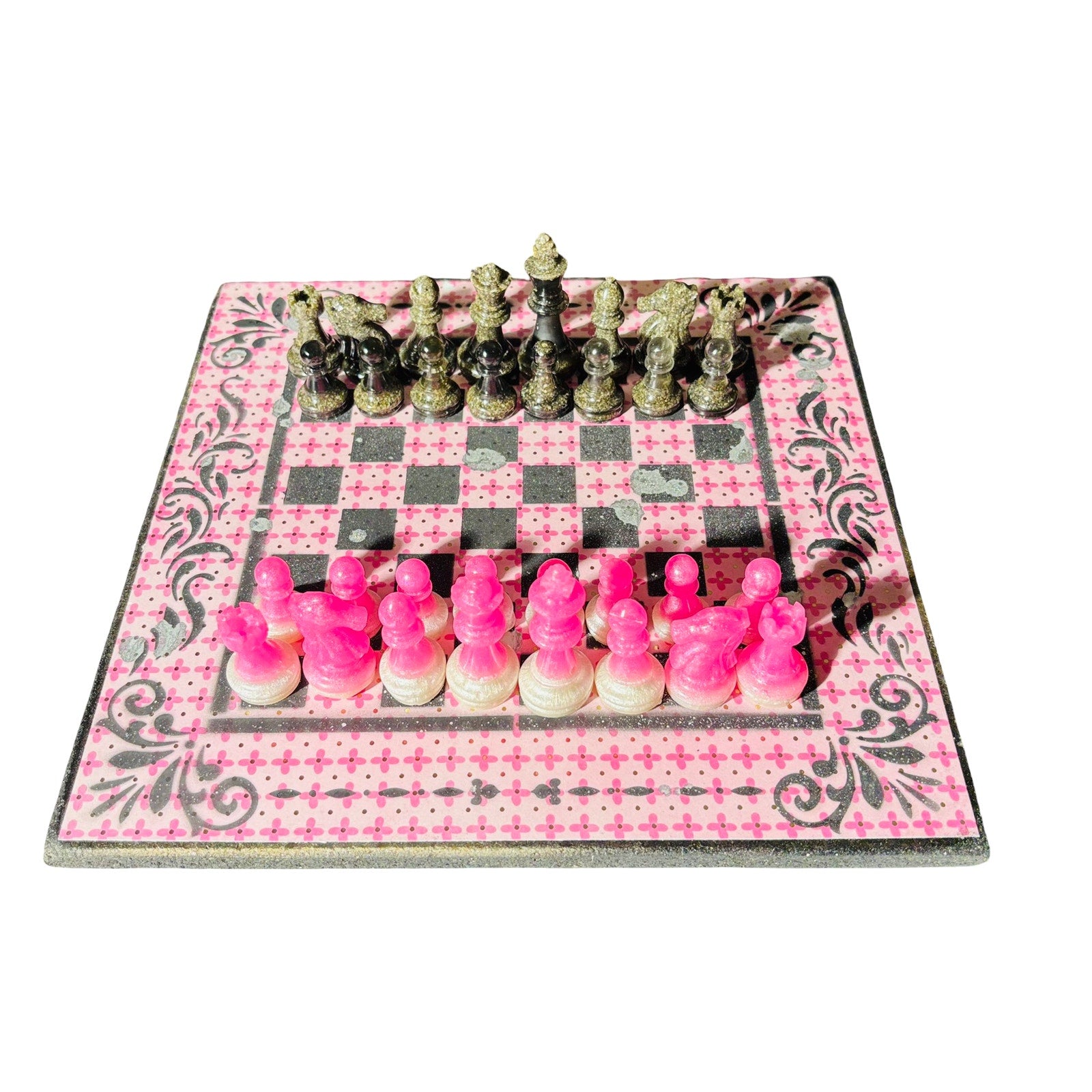 Introducing our exclusive Handcrafted Wooden Chess Set, meticulously designed with precision and care. Measuring 12 inches by 12 inches, this chess set features a beautifully painted particle board layered with a sheet of scrapbook paper board that doubles as a work of art. Each set is a unique, one-of-a-kind creation, crafted by hand to ensure that no two sets are alike. Elevate your gaming experience with this exceptional chess set that combines vibrant design with the touch of artisan craftsmanship. This chess board comes with chess pieces and is handcrafted as a one of one