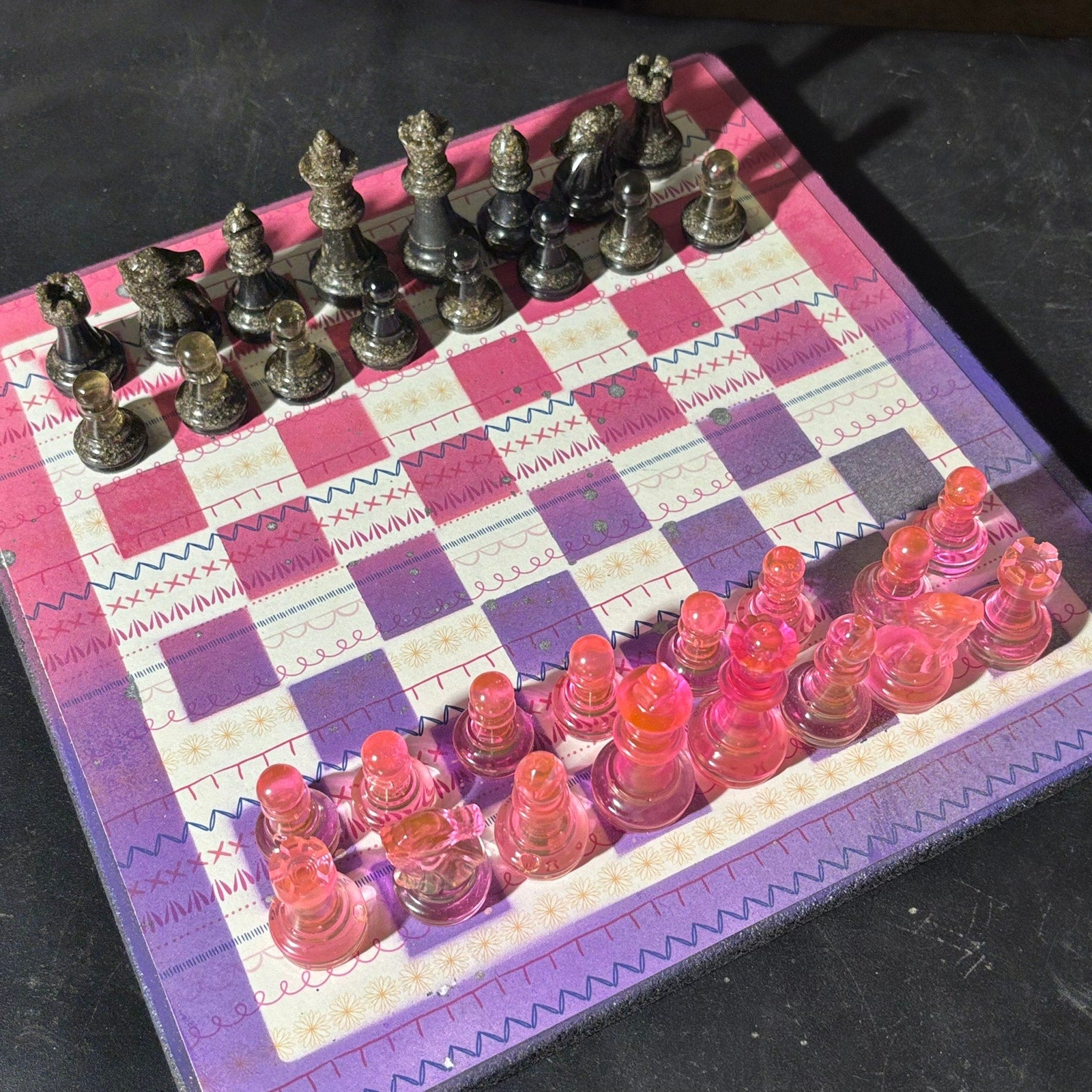 Introducing our exclusive Handcrafted Wooden Chess Set, meticulously designed with precision and care. Measuring 12 inches by 12 inches, this chess set features a beautifully painted particle board layered with a sheet of scrapbook paper board that doubles as a work of art. Each set is a unique, one-of-a-kind creation, crafted by hand to ensure that no two sets are alike. Elevate your gaming experience with this exceptional chess set that combines vibrant design with the touch of artisan craftsmanship. This chess board comes with chess pieces and is handcrafted as a one of one