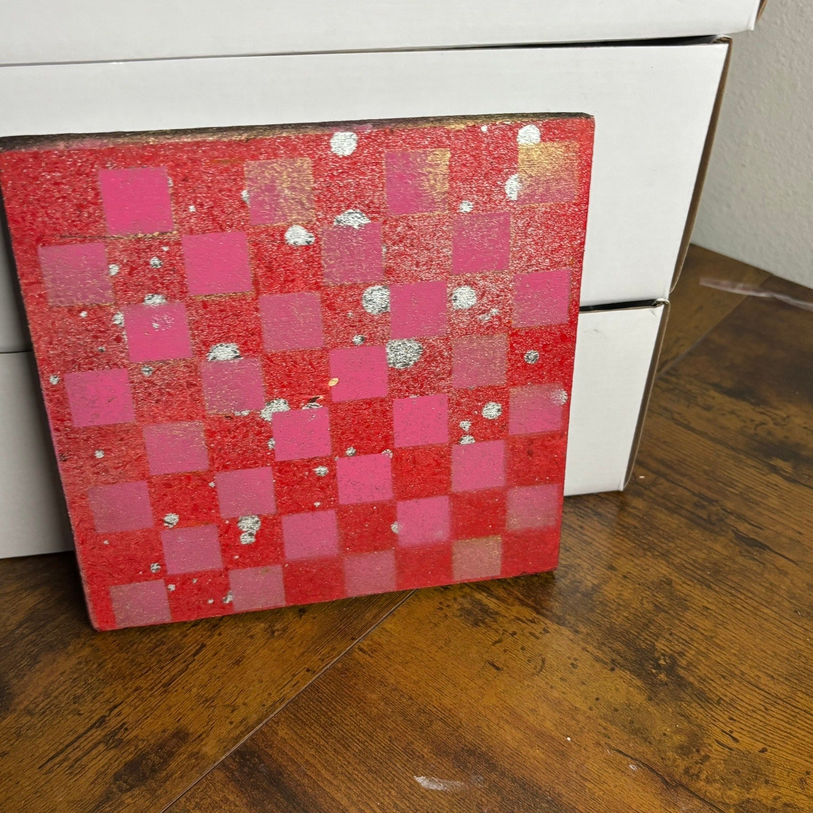 This is a one-of-a-kind, hand-painted chess board that will add a touch of artistry to your game. These are spray painted particle boards and have a double side. One side is painted and the backside is lined with scrapbook paper and has a different design. (The Scrapbook paper part is not meant to be played on but you can!)