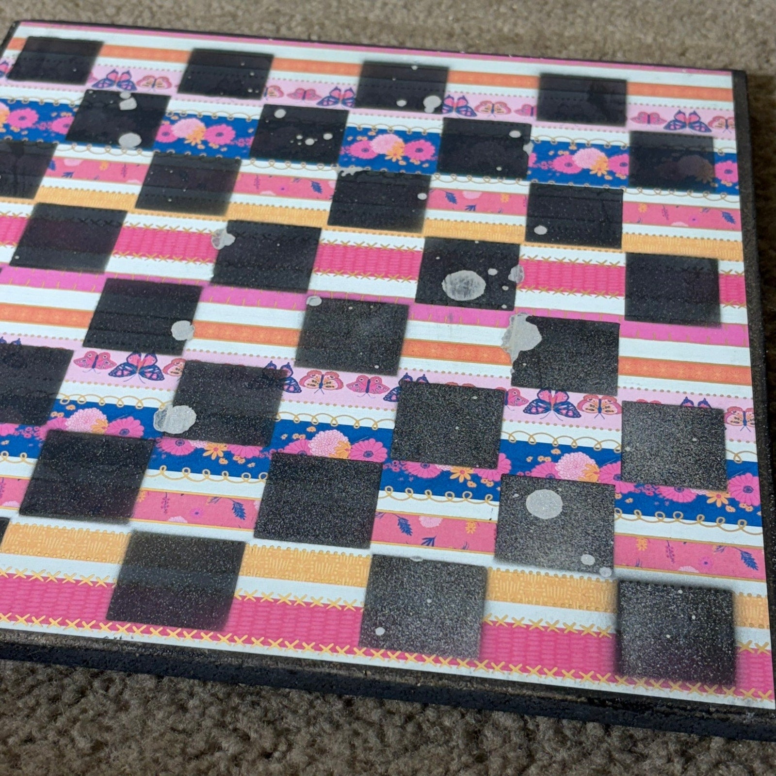 Each board features a layer of beautifully Scrapbook Paper Fused/Glued with particle board to give it a unique pretty pattern. We then paint squares onto the board to make them into fabulous chess boards. Made with a sturdy particle board base and smooth, beveled edges, this board is stunning.