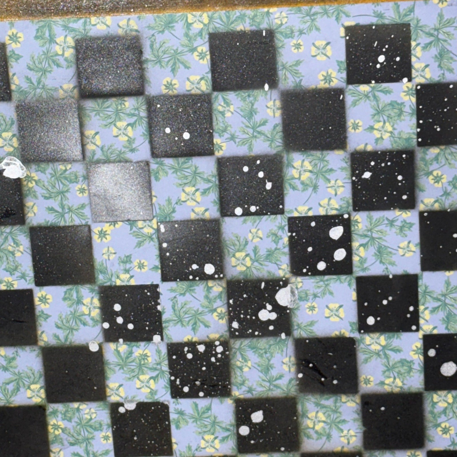 The board is crafted from durable particle board, painted with care to create the classic chess square pattern. What makes this board special is the unique 12x12 piece of scrapbook paper inlaid in the center, adding a personal touch to your game.