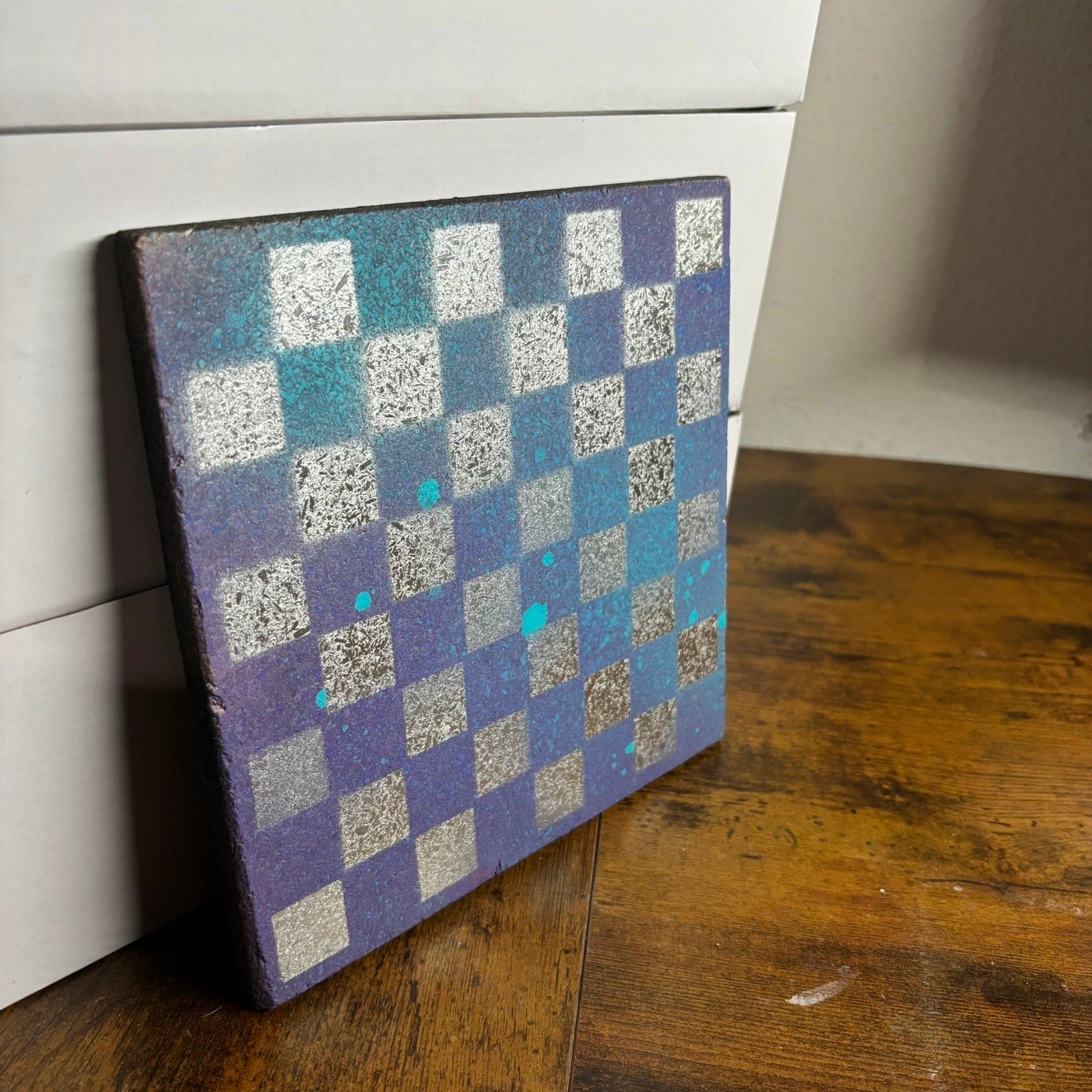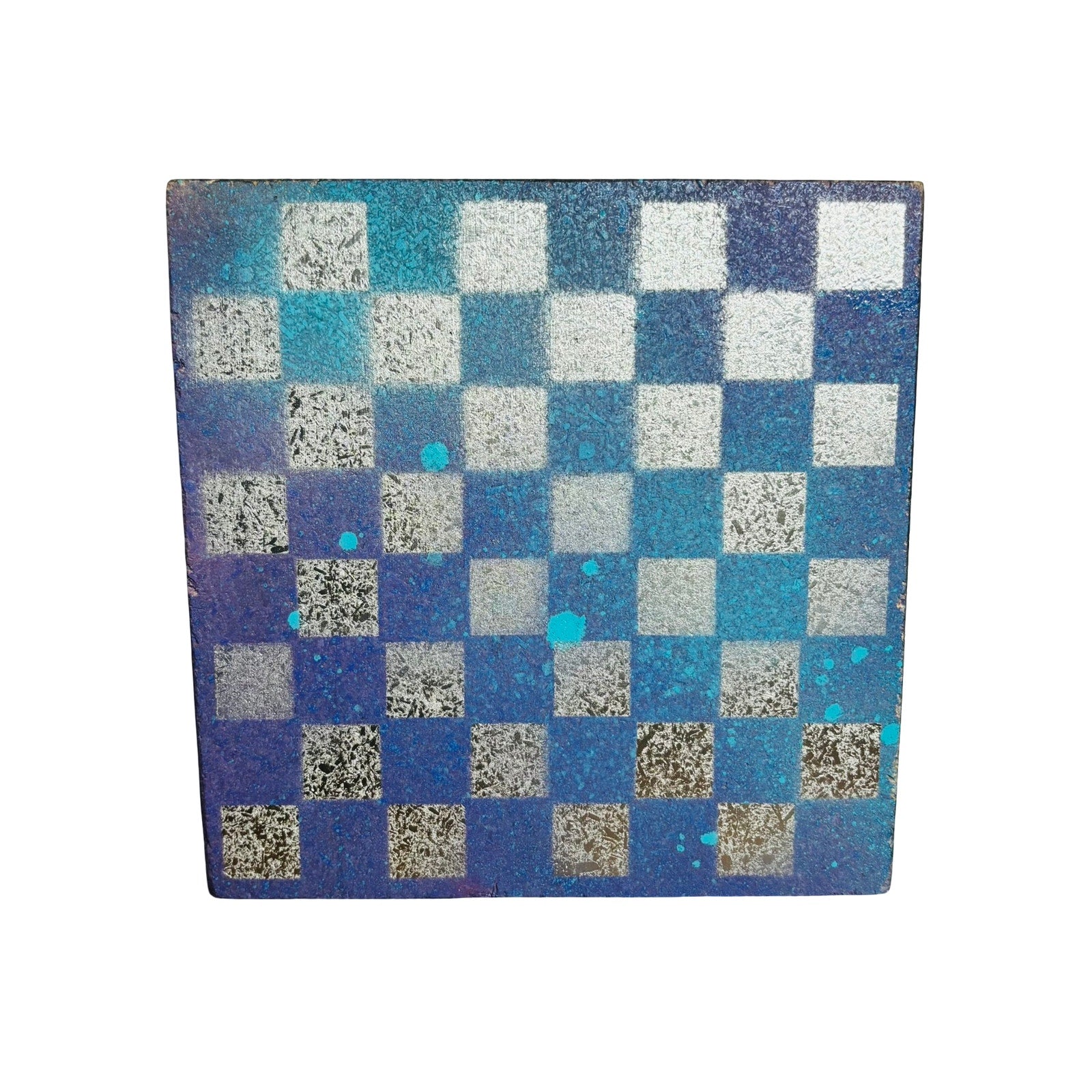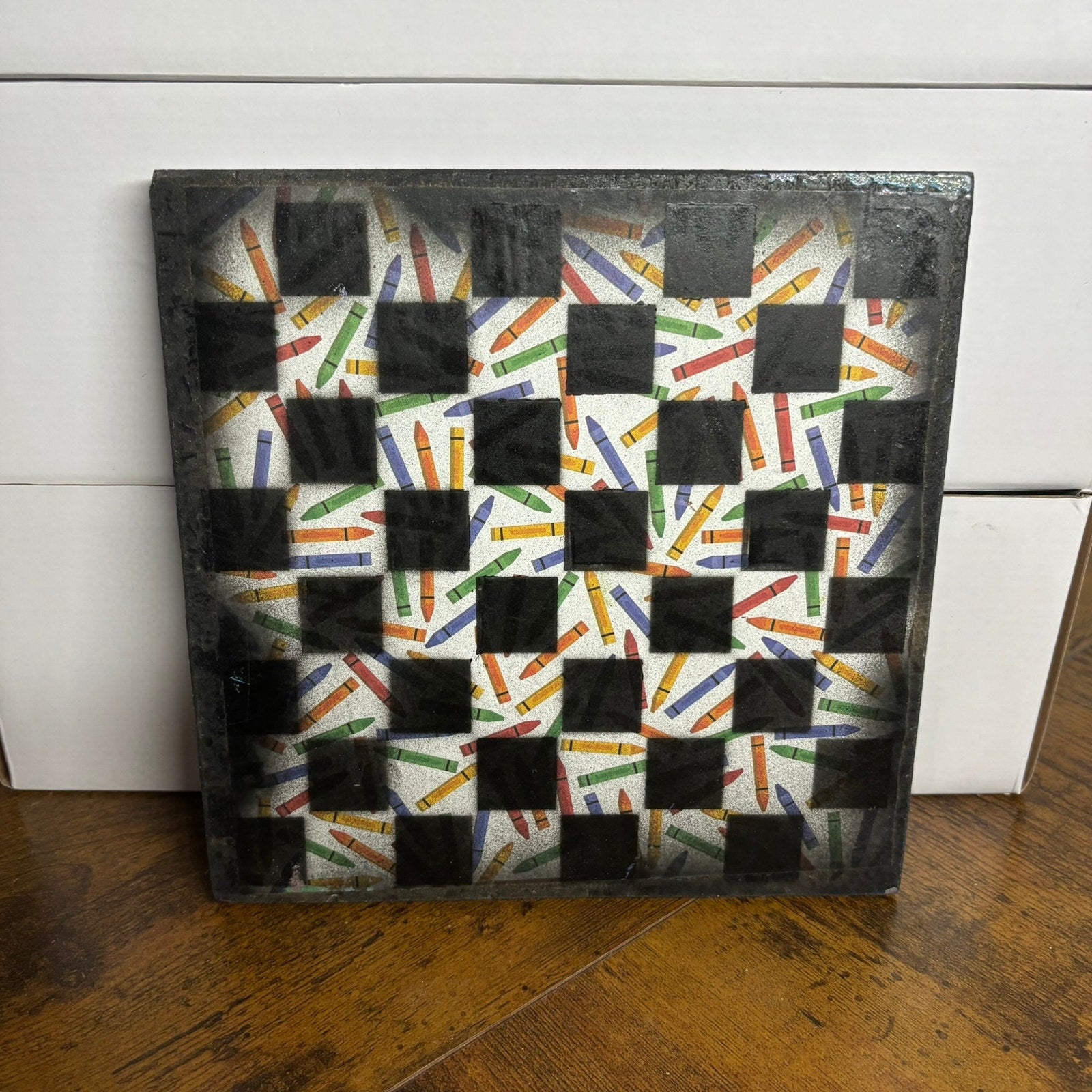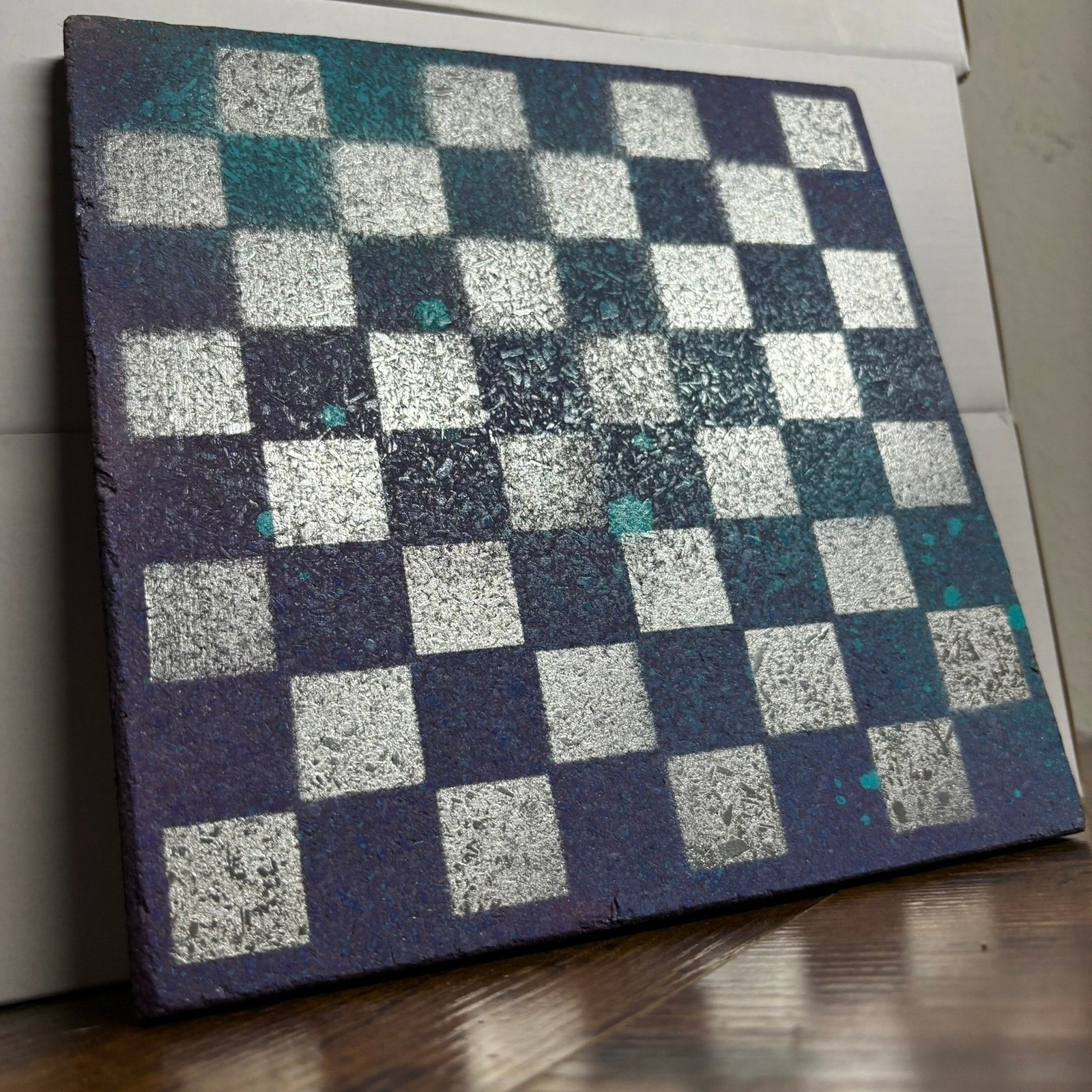This is a one-of-a-kind, hand-painted chess board that will add a touch of artistry to your game. These are spray painted particle boards and have a double side. One side is painted and the backside is lined with scrapbook paper and has a different design. (The Scrapbook paper part is not meant to be played on but you can!)