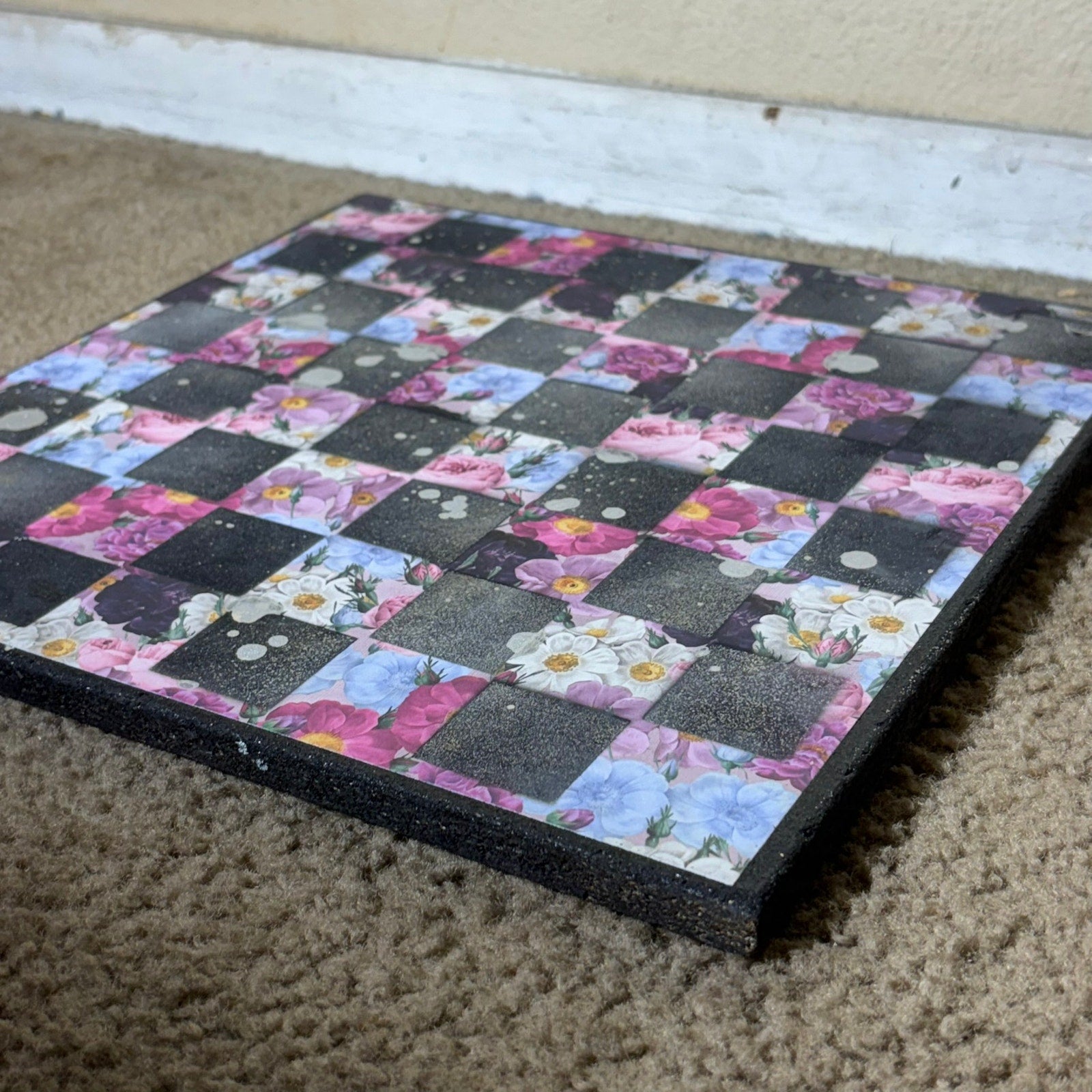 Each board features a layer of beautifully Scrapbook Paper Fused/Glued with particle board to give it a unique pretty pattern. We then paint squares onto the board to make them into fabulous chess boards. Made with a sturdy particle board base and smooth, beveled edges, this board is stunning.