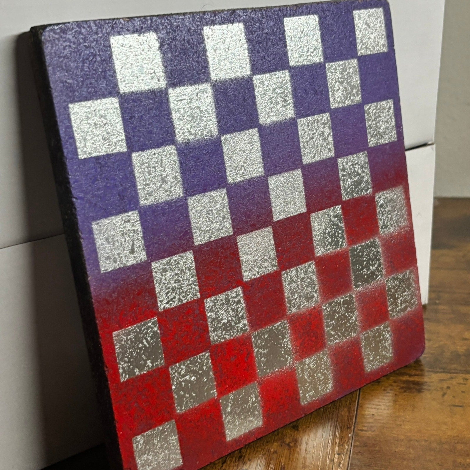 This is a one-of-a-kind, hand-painted chess board that will add a touch of artistry to your game. These are spray painted particle boards and have a double side. One side is painted and the backside is lined with scrapbook paper and has a different design. (The Scrapbook paper part is not meant to be played on but you can!)