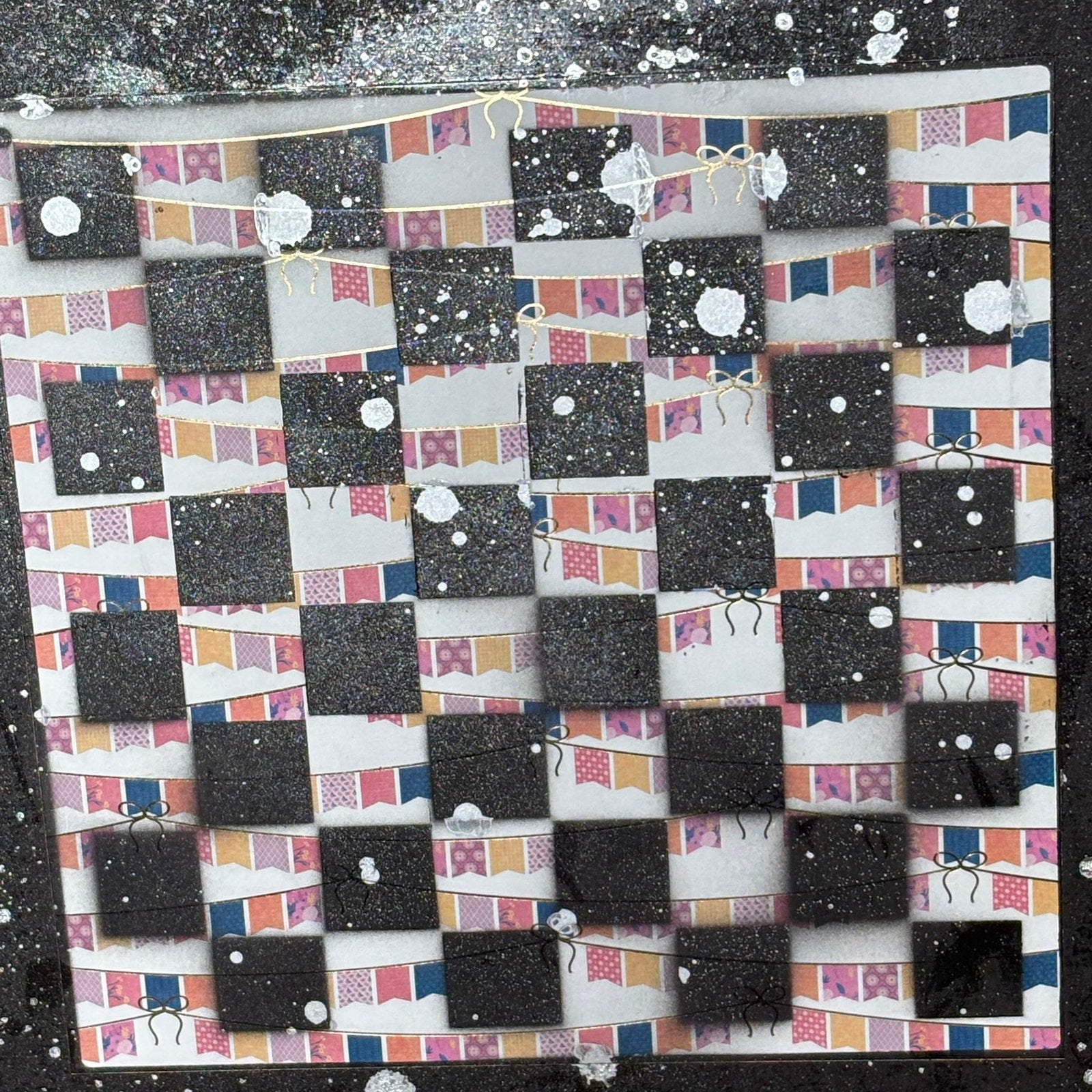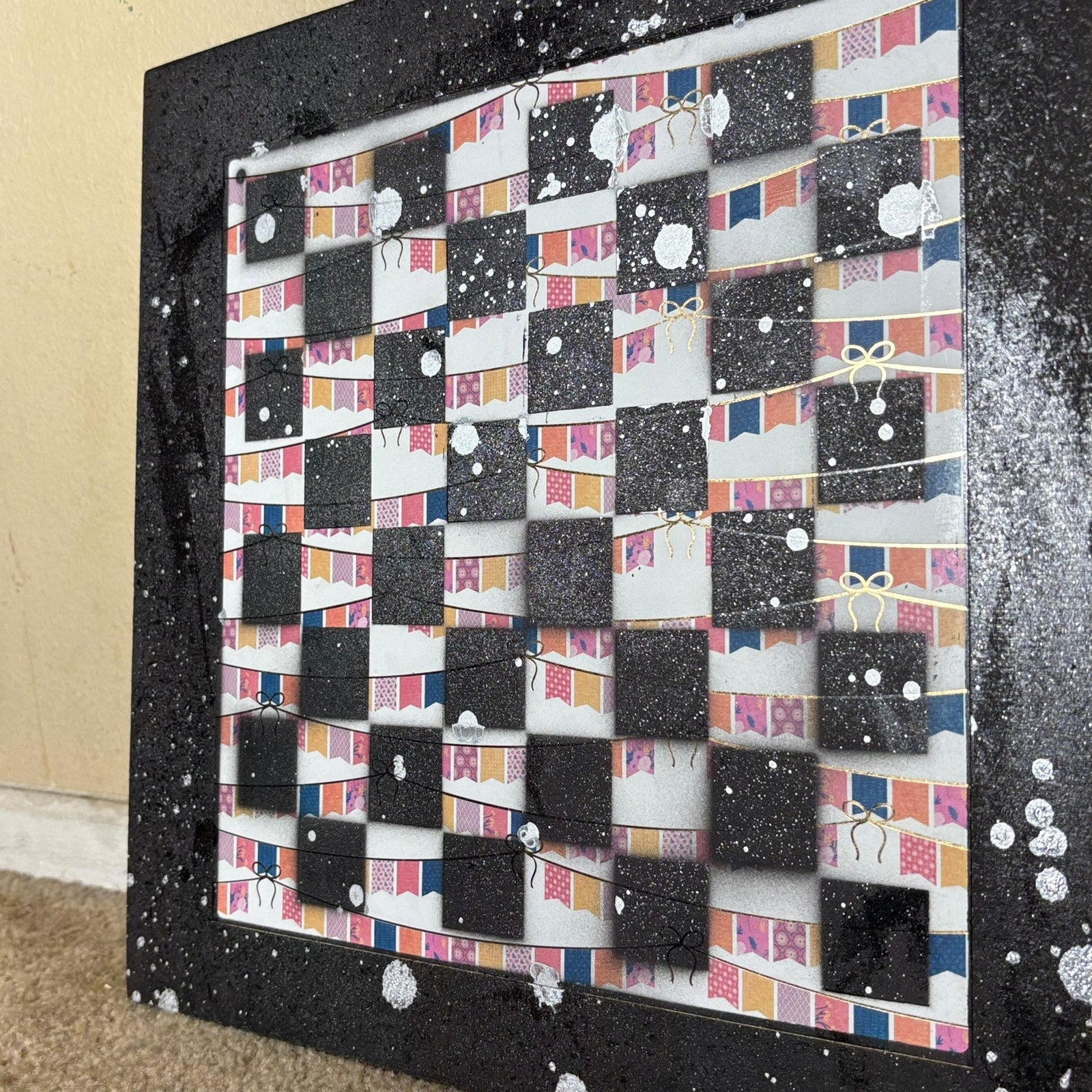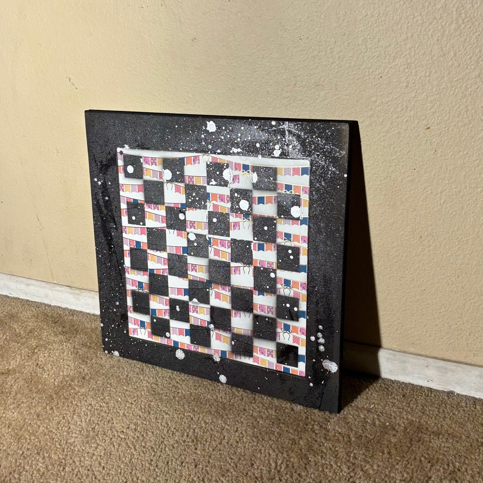 The board is crafted from durable particle board, painted with care to create the classic chess square pattern. What makes this board special is the unique 12x12 piece of scrapbook paper inlaid in the center, adding a personal touch to your game.