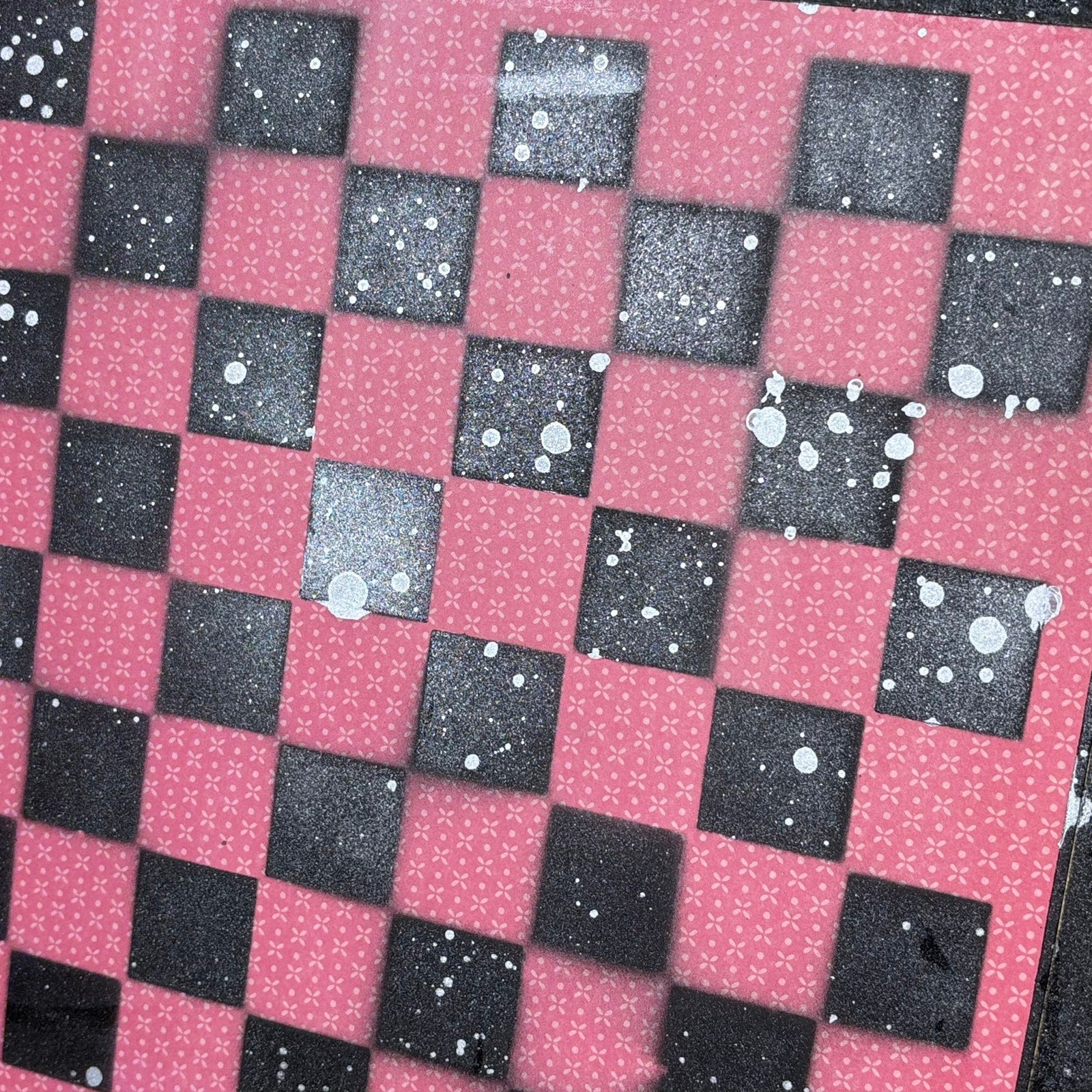 The board is crafted from durable particle board, painted with care to create the classic chess square pattern. What makes this board special is the unique 12x12 piece of scrapbook paper inlaid in the center, adding a personal touch to your game.