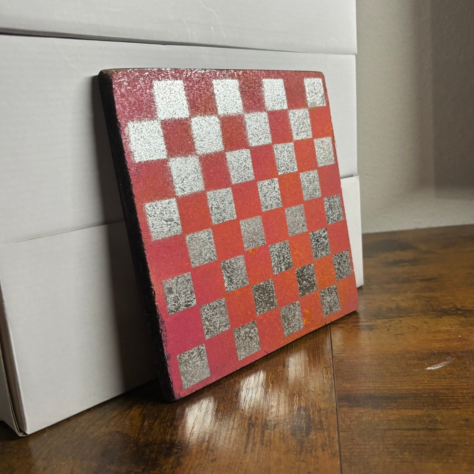 This is a one-of-a-kind, hand-painted chess board that will add a touch of artistry to your game. These are spray painted particle boards and have a double side. One side is painted and the backside is lined with scrapbook paper and has a different design. (The Scrapbook paper part is not meant to be played on but you can!)
