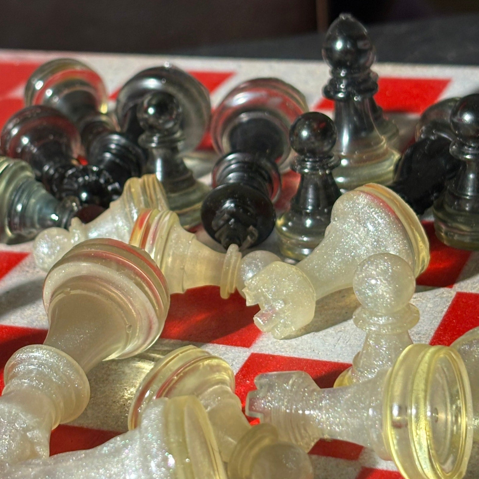 *** PLEASE READ: The resin pieces that have clear transparent parts will slowly turn royal amber as time goes on (Clear see through resin turn amber with time). Most of the sets are solid or colored so there is no need to expect a change at all, but some have clear transparent bottoms that will turn amber. I write this because some of our chess sets may not sell for a year or two and the photos are taken when the item is listed online. Meaning the photos will have slight difference. Rest assured, the amber is beautiful and vintage!