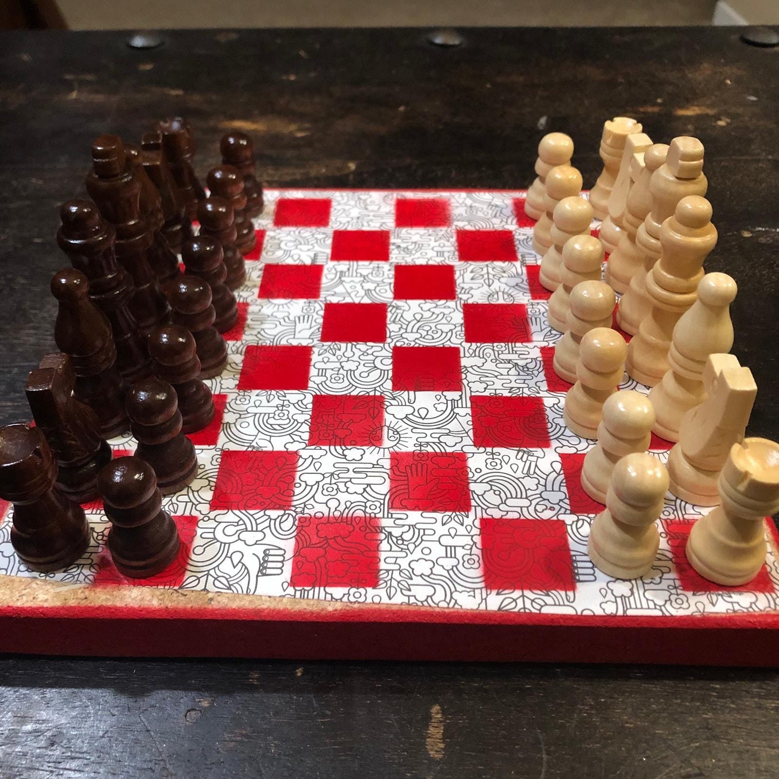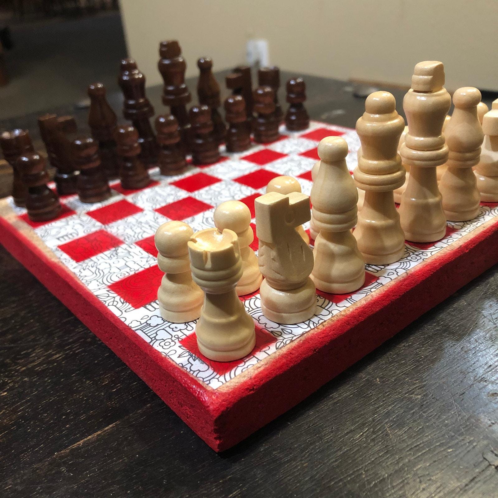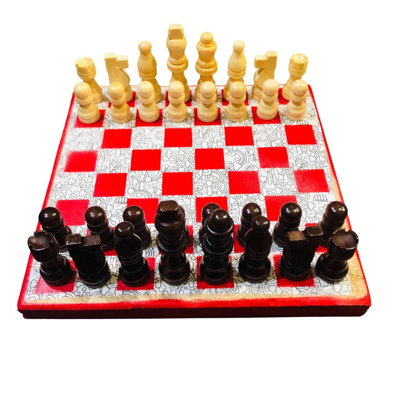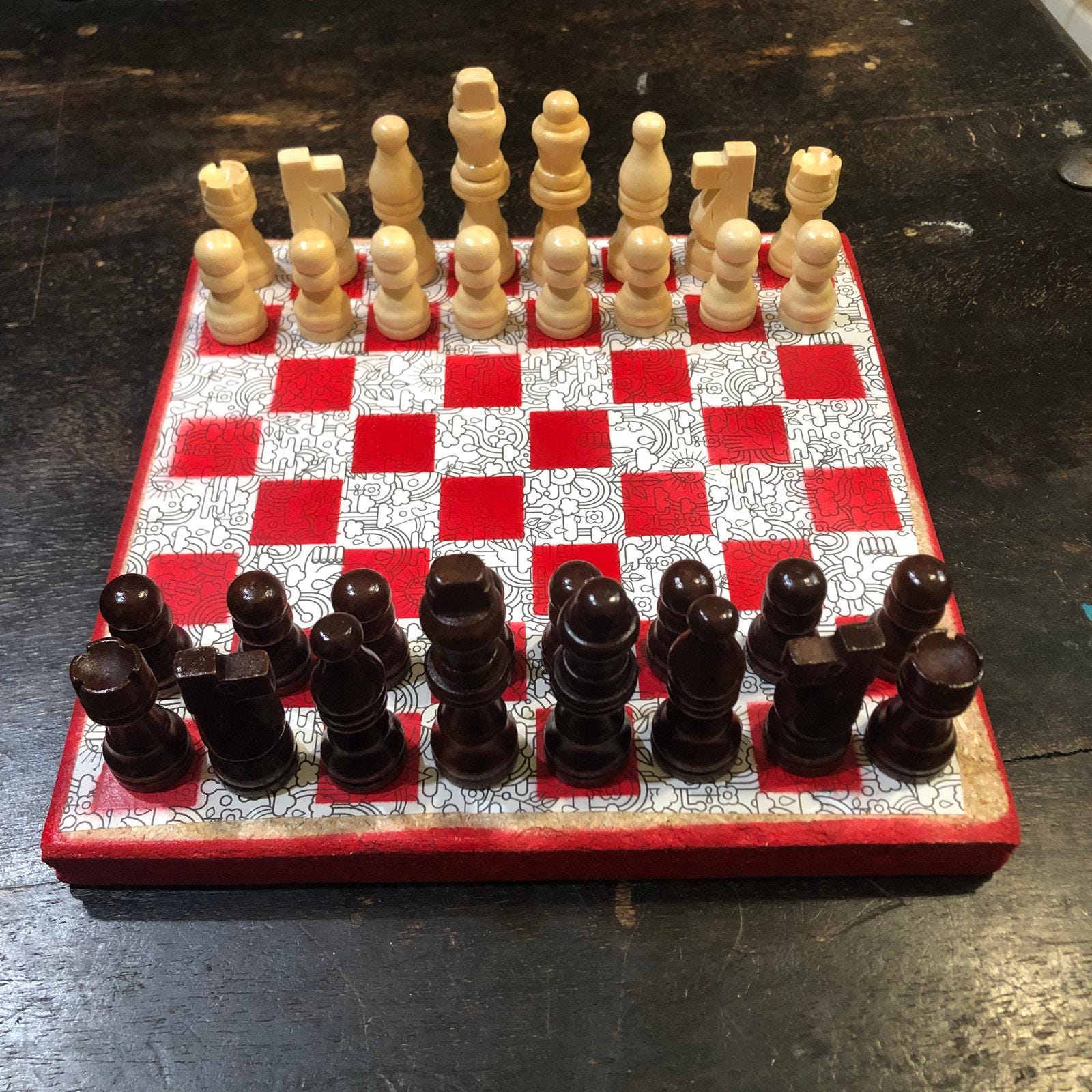 Introducing our exclusive Handcrafted Wooden Chess Set, meticulously designed with precision and care. Measuring 8 inches by 8 inches, this chess set features a beautifully painted particle board layered with a sheet of scrapbook paper board that doubles as a work of art. Each set is a unique, one-of-a-kind creation, crafted by hand to ensure that no two sets are alike. Elevate your gaming experience with this exceptional chess set that combines vibrant design with the touch of artisan craftsmanship. This chess board comes with chess pieces and is handcrafted as a one of one