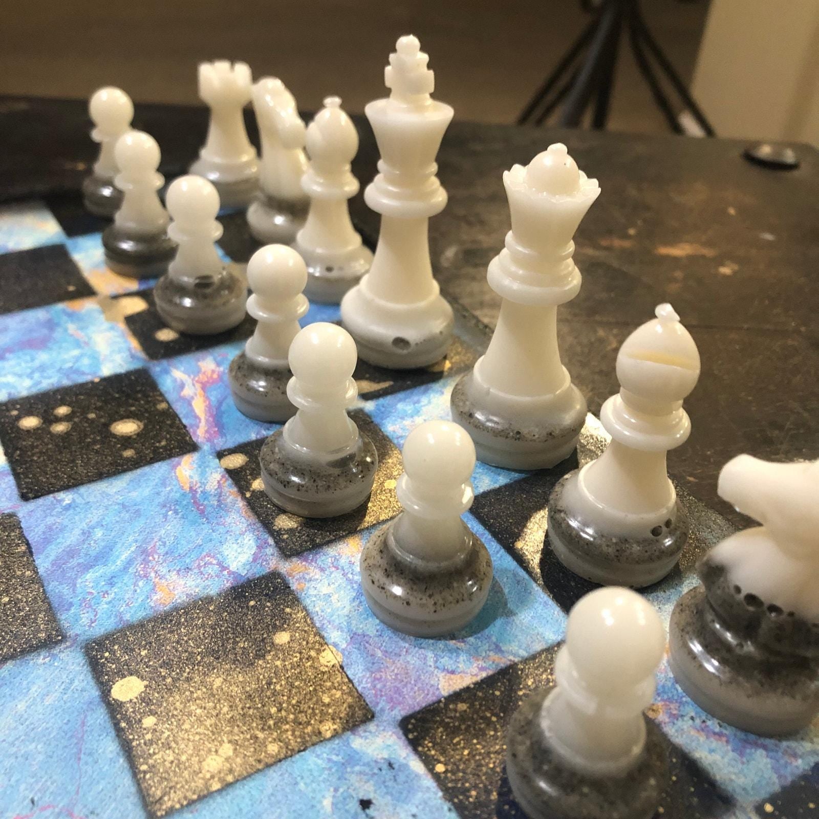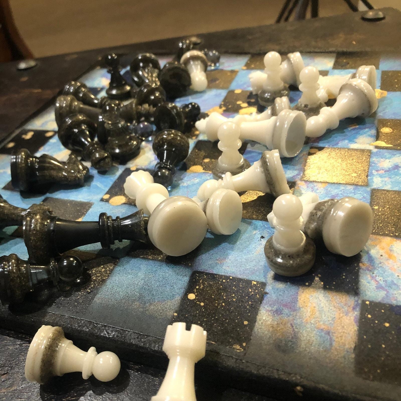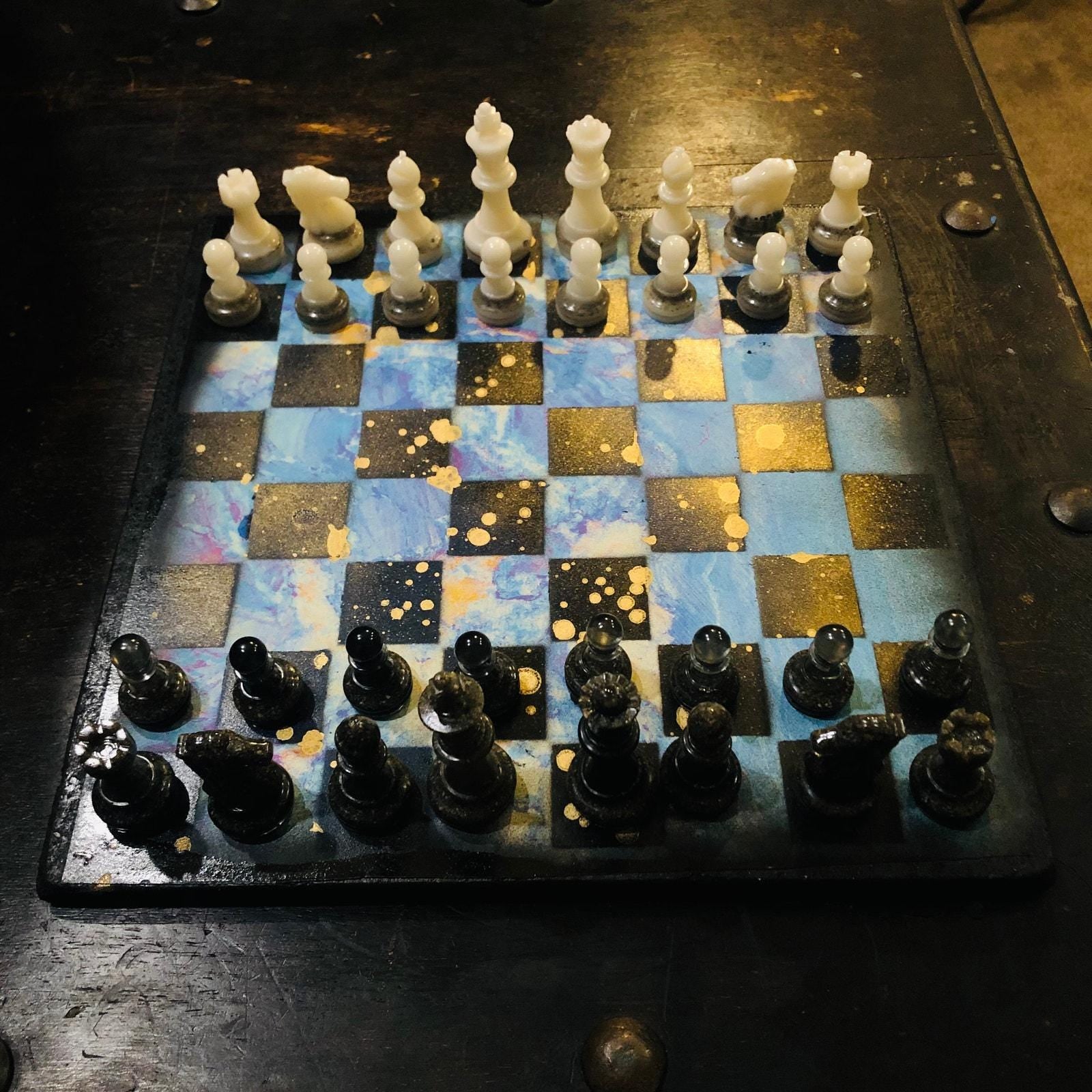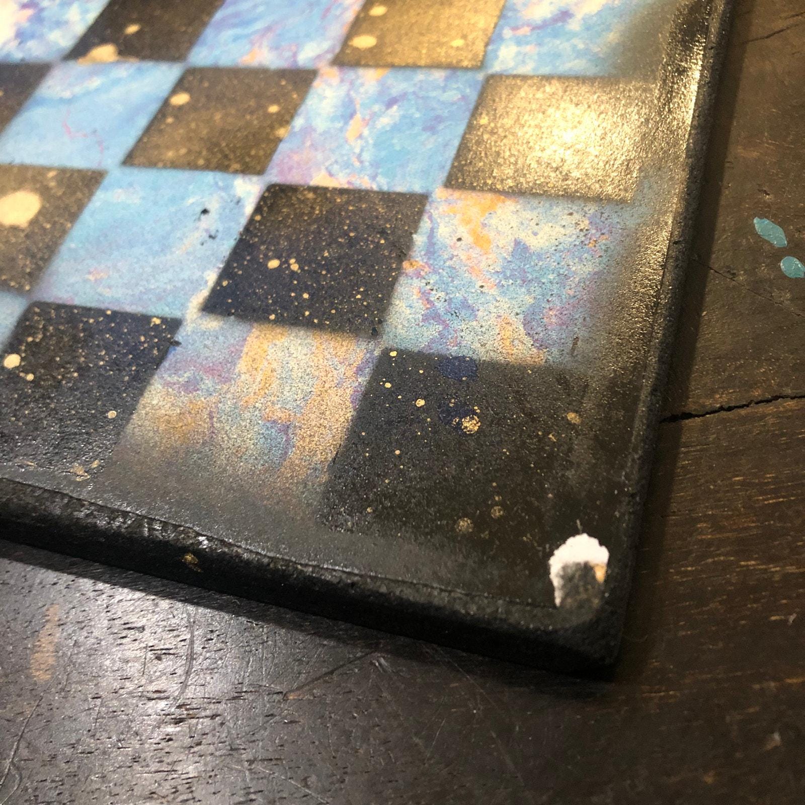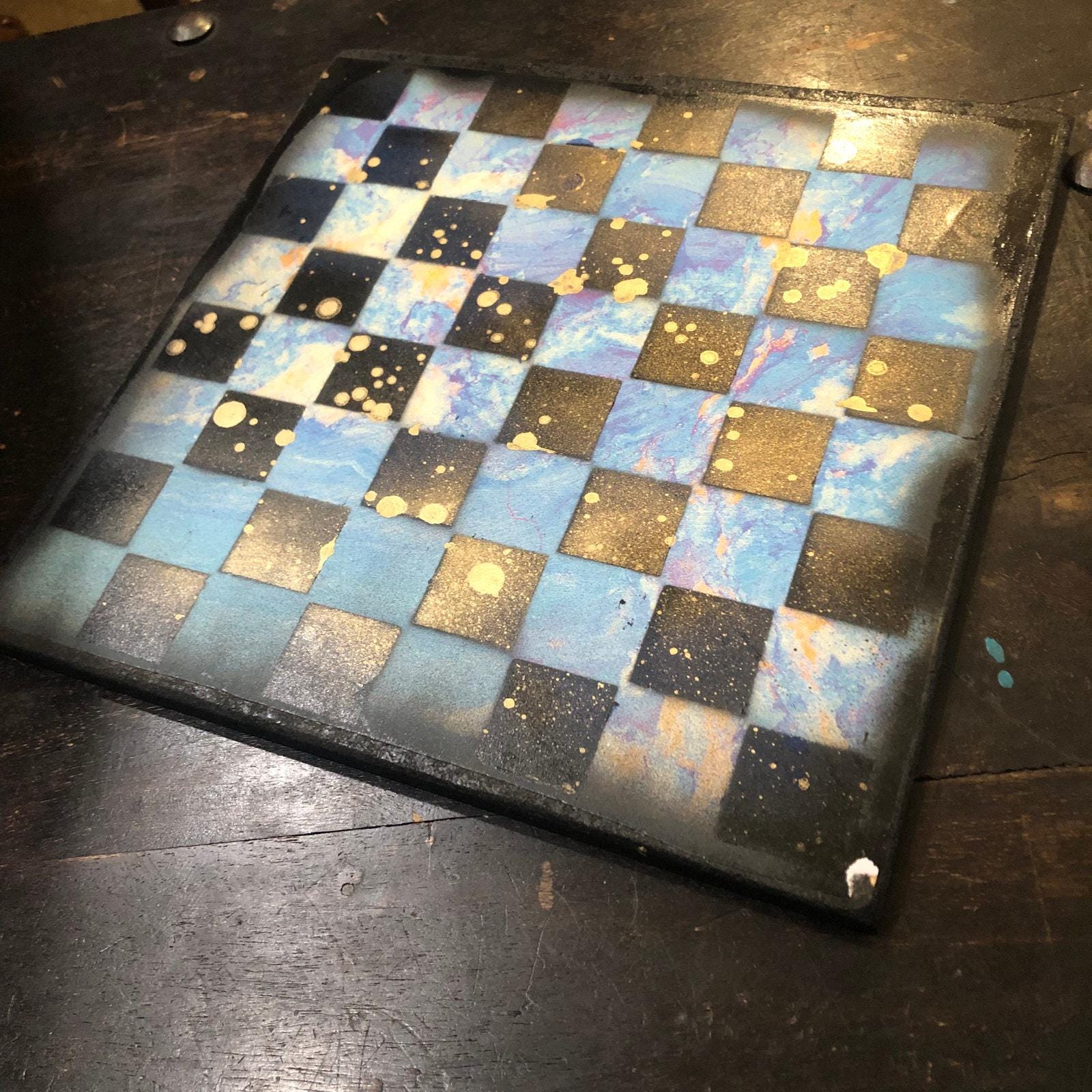 Introducing our exclusive Handcrafted Wooden Chess Set, meticulously designed with precision and care. Measuring 12 inches by 12 inches, this chess set features a beautifully painted particle board layered with a sheet of scrapbook paper board that doubles as a work of art. Each set is a unique, one-of-a-kind creation, crafted by hand to ensure that no two sets are alike. Elevate your gaming experience with this exceptional chess set that combines vibrant design with the touch of artisan craftsmanship. This chess board comes with chess pieces and is handcrafted as a one of one