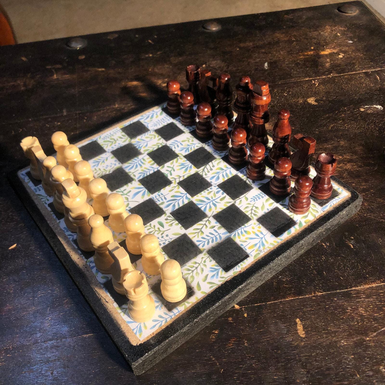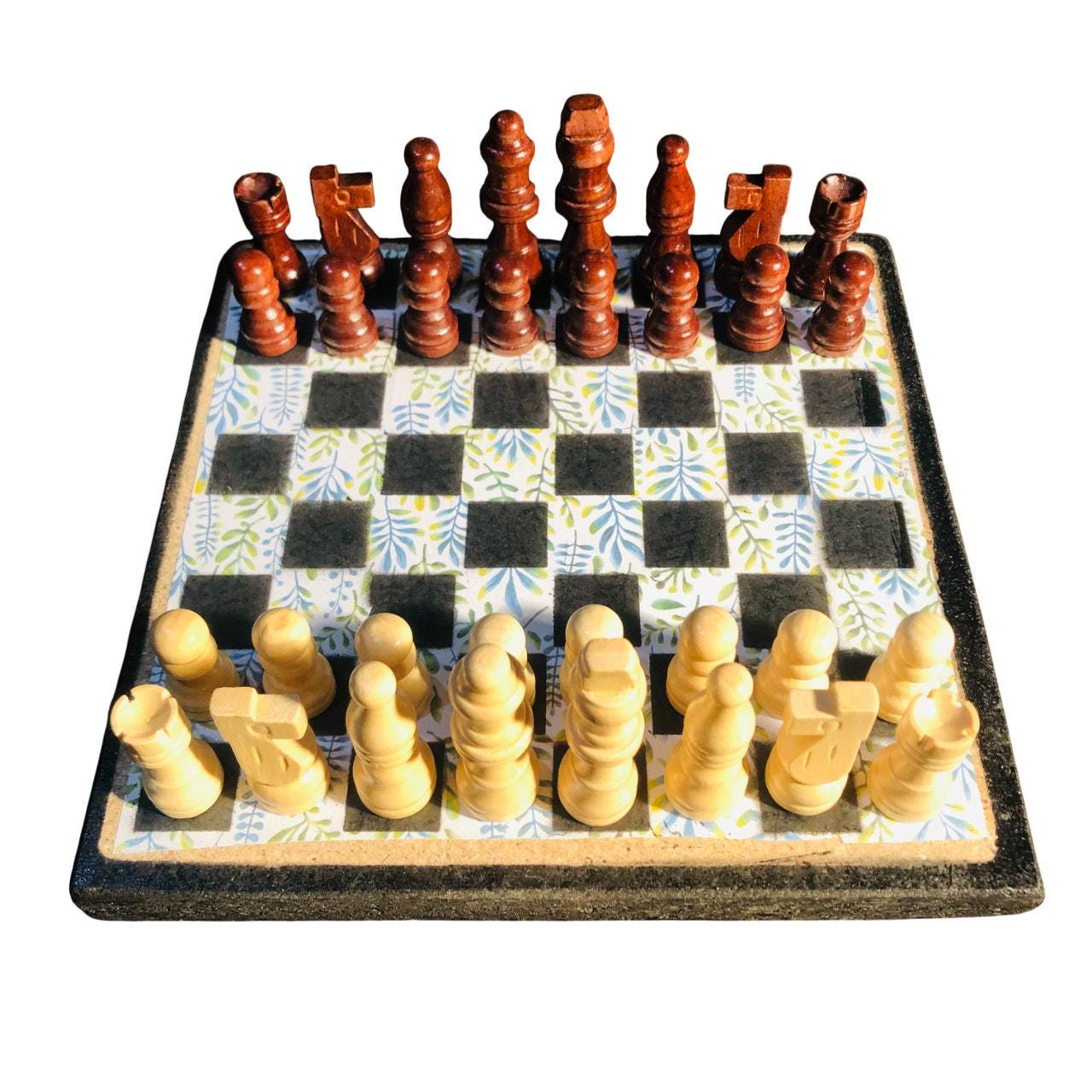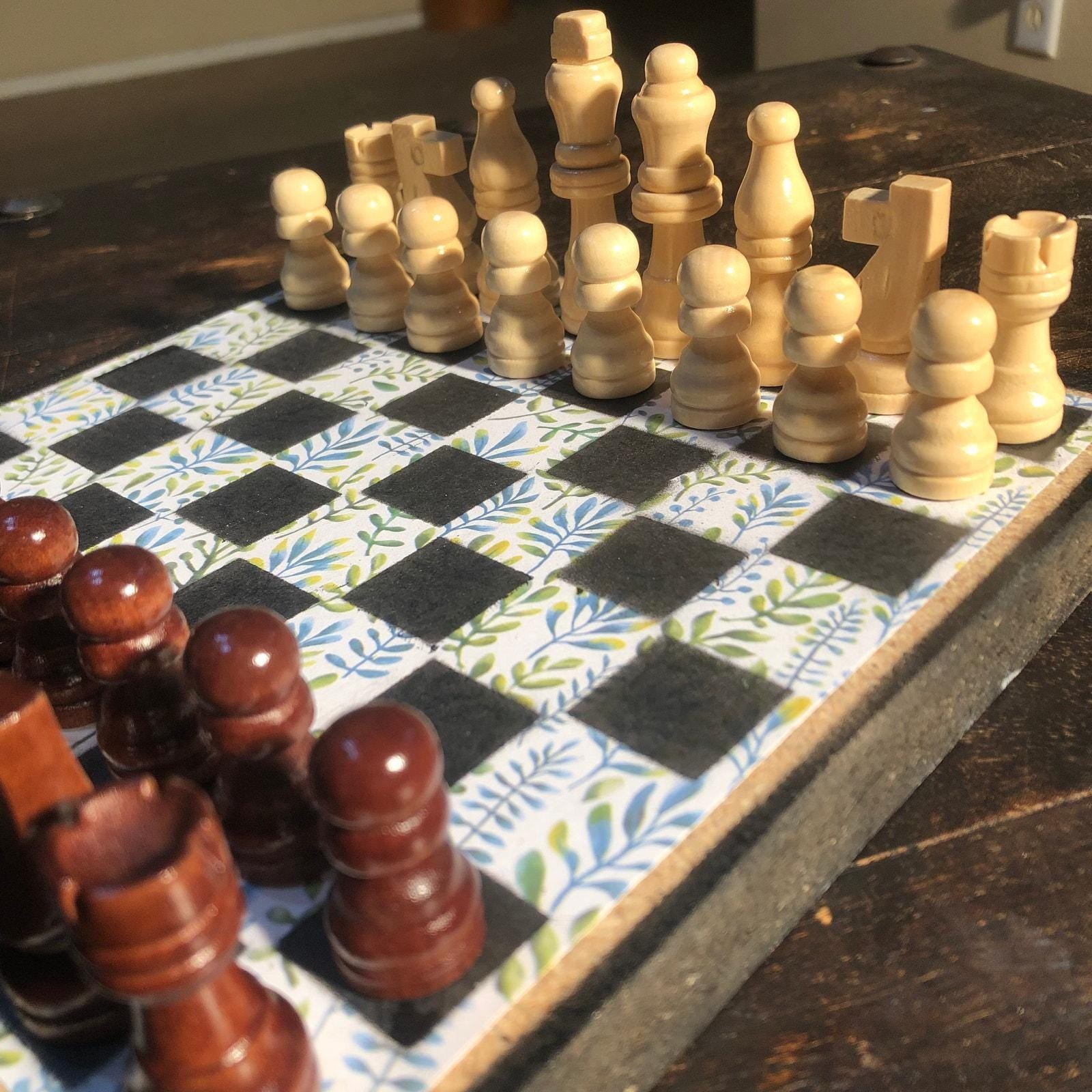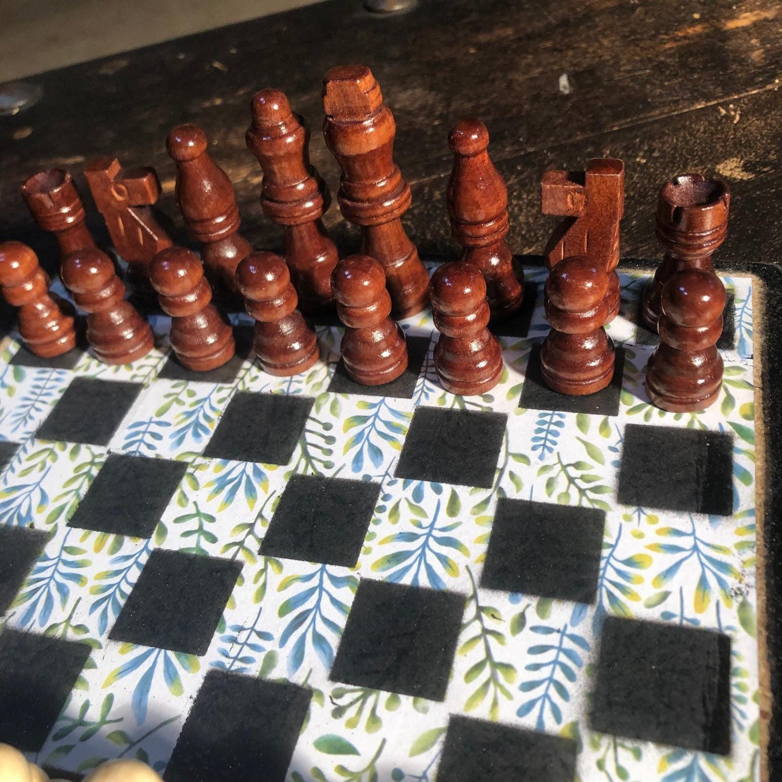 Introducing our exclusive Handcrafted Wooden Chess Set, meticulously designed with precision and care. Measuring 8 inches by 8 inches, this chess set features a beautifully painted particle board layered with a sheet of scrapbook paper board that doubles as a work of art. Each set is a unique, one-of-a-kind creation, crafted by hand to ensure that no two sets are alike. Elevate your gaming experience with this exceptional chess set that combines vibrant design with the touch of artisan craftsmanship. This chess board comes with chess pieces and is handcrafted as a one of one