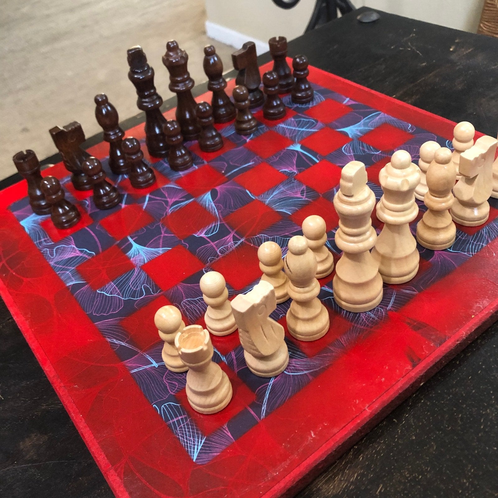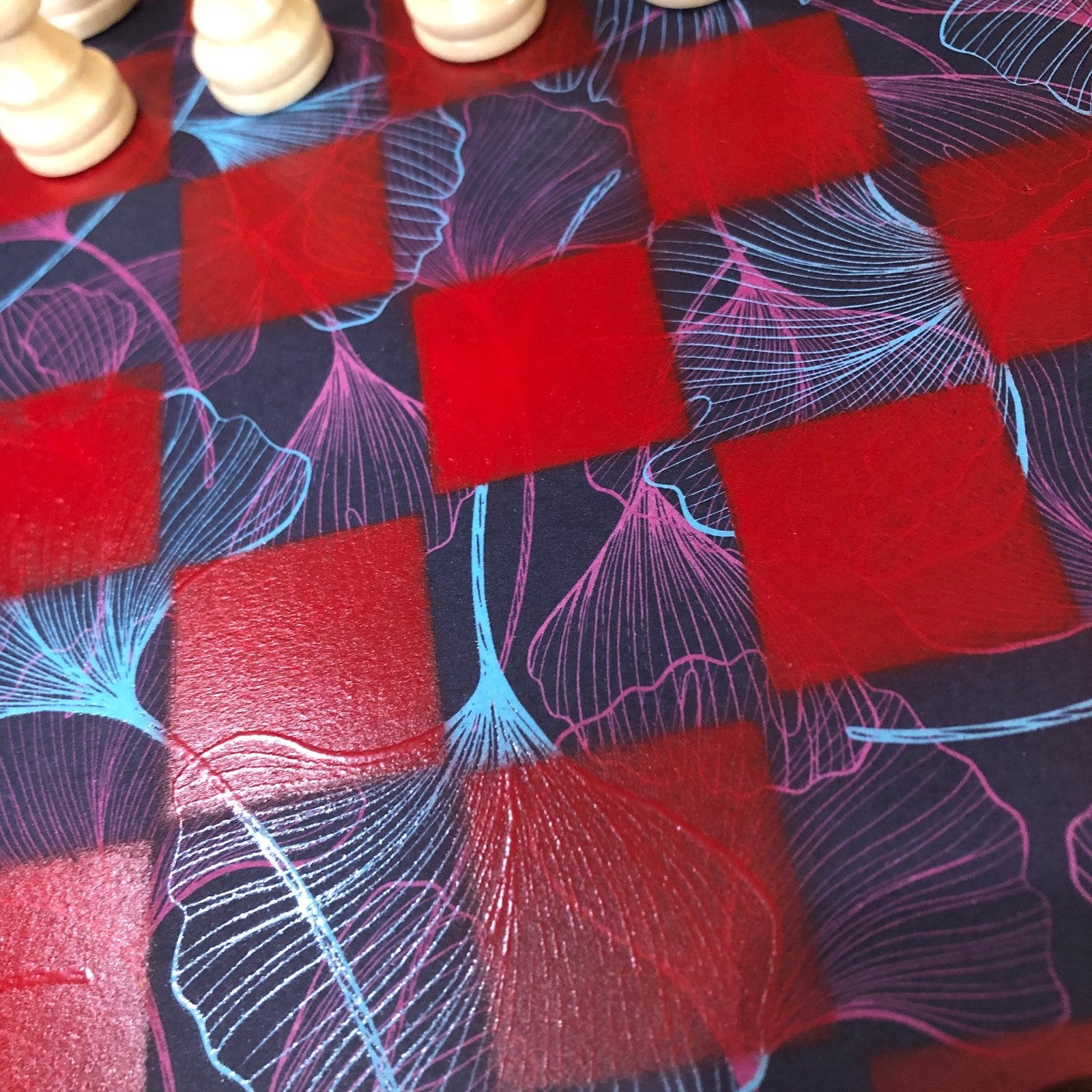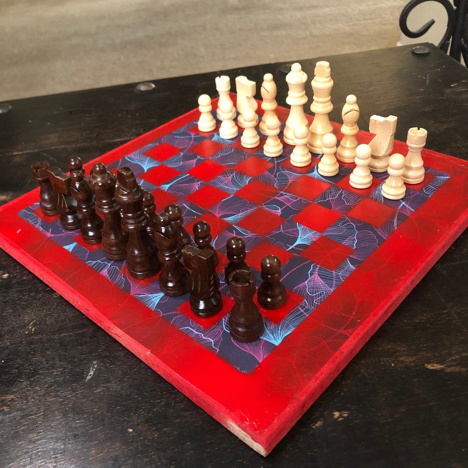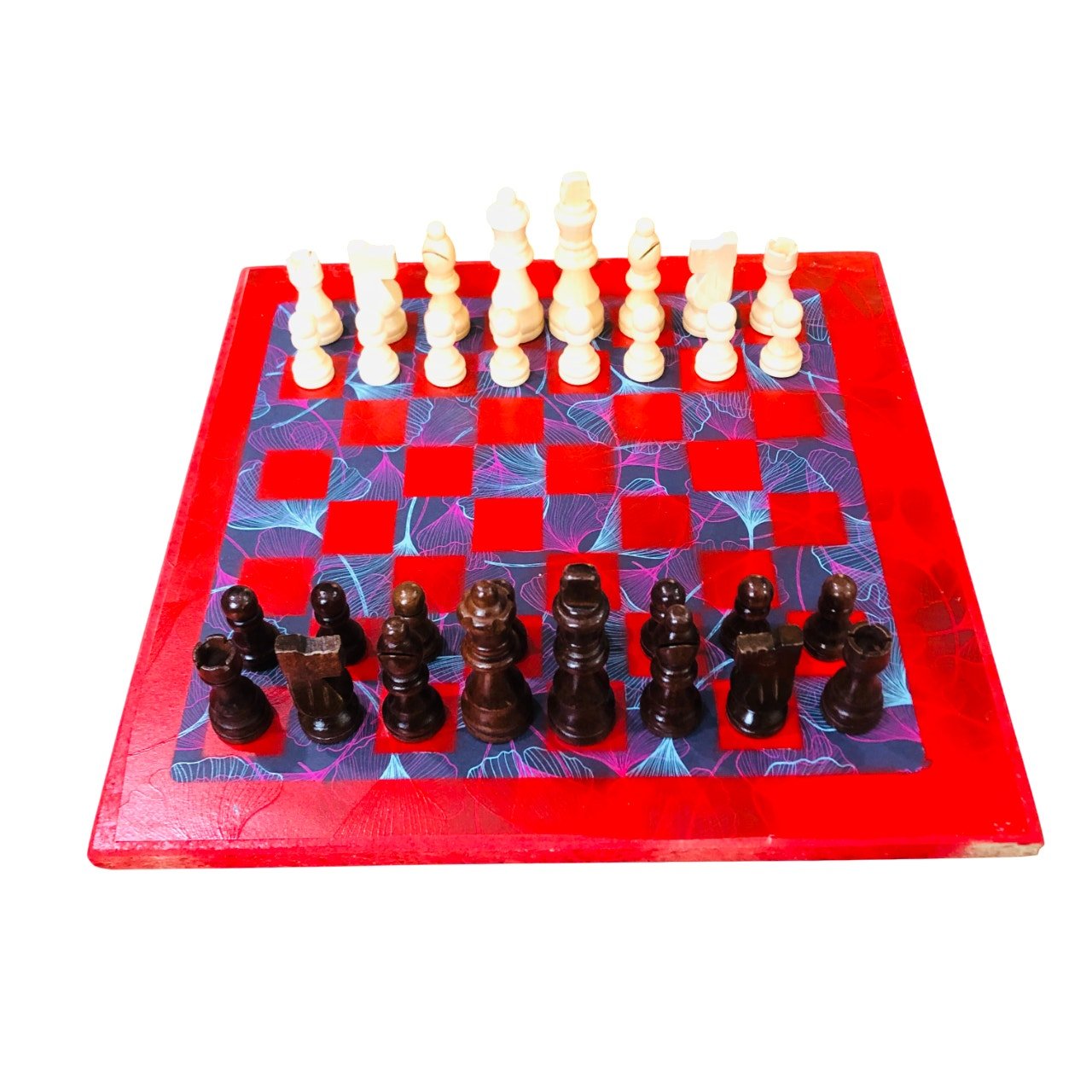 Introducing our exclusive Handcrafted Wooden Chess Set, meticulously designed with precision and care. Measuring 12 inches by 12 inches, this chess set features a beautifully painted particle board layered with a sheet of scrapbook paper board that doubles as a work of art. Each set is a unique, one-of-a-kind creation, crafted by hand to ensure that no two sets are alike. Elevate your gaming experience with this exceptional chess set that combines vibrant design with the touch of artisan craftsmanship. This chess board comes with chess pieces and is handcrafted as a one of one