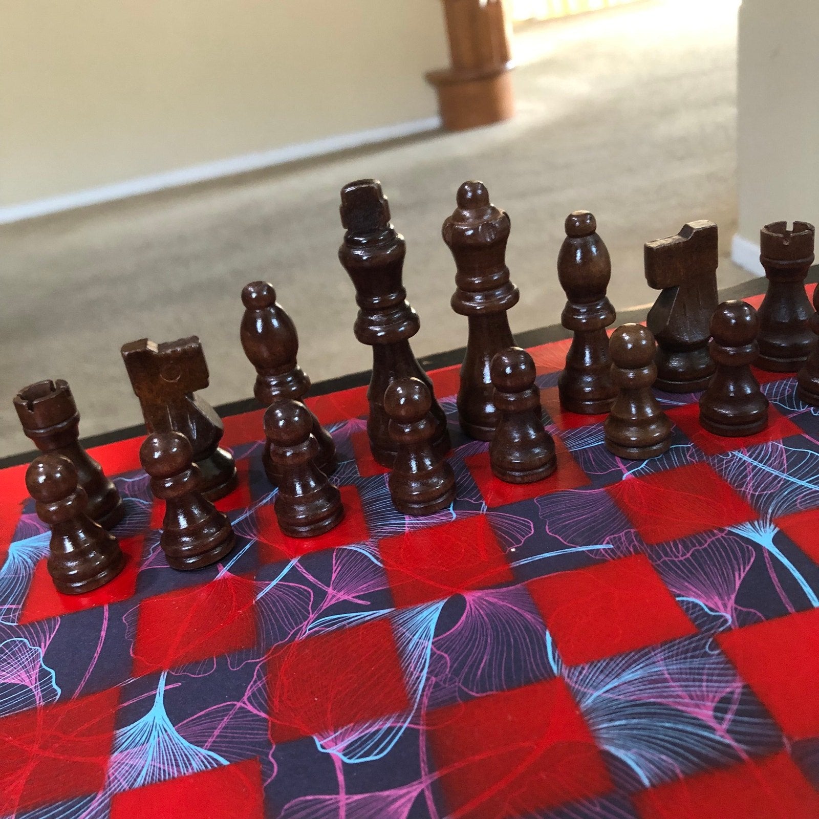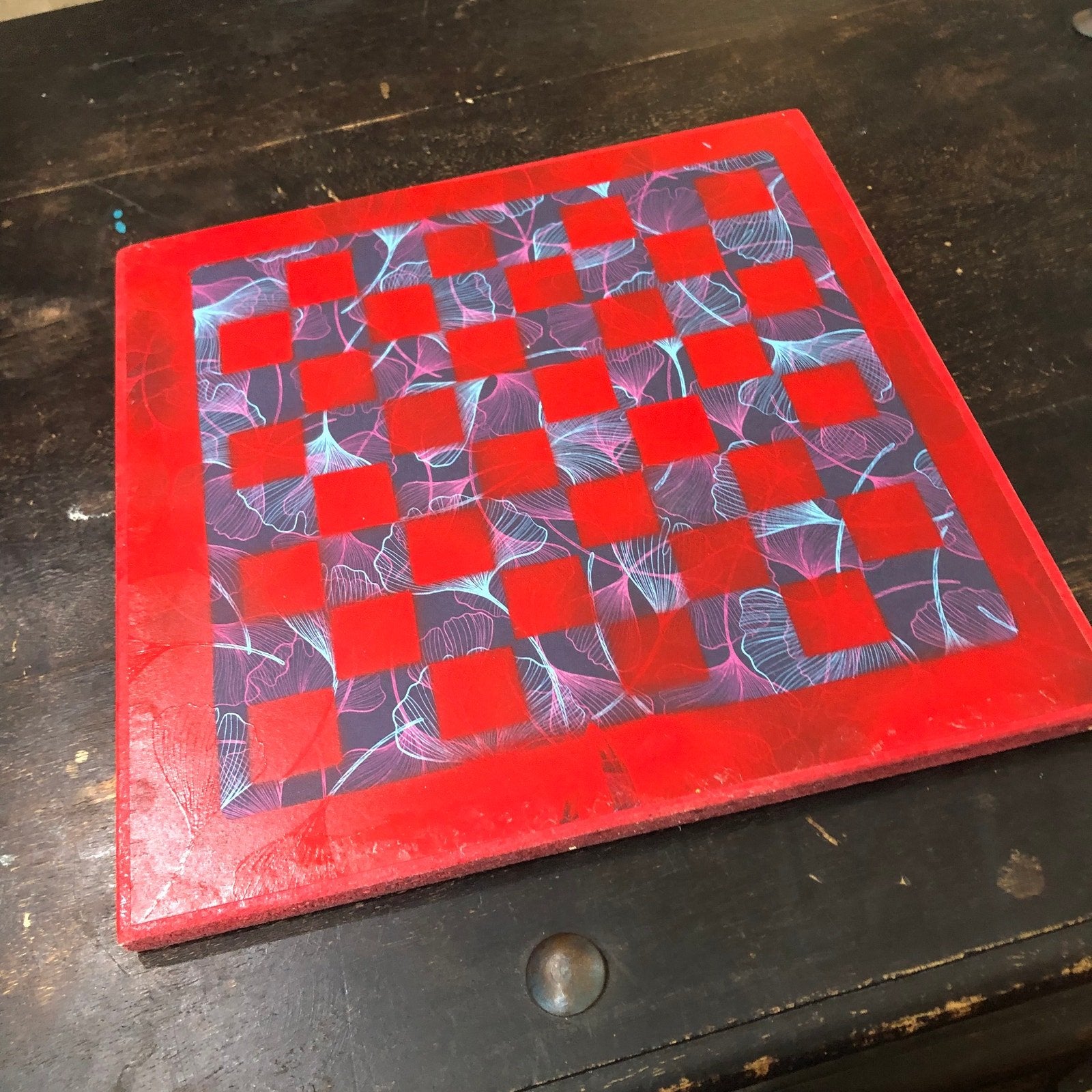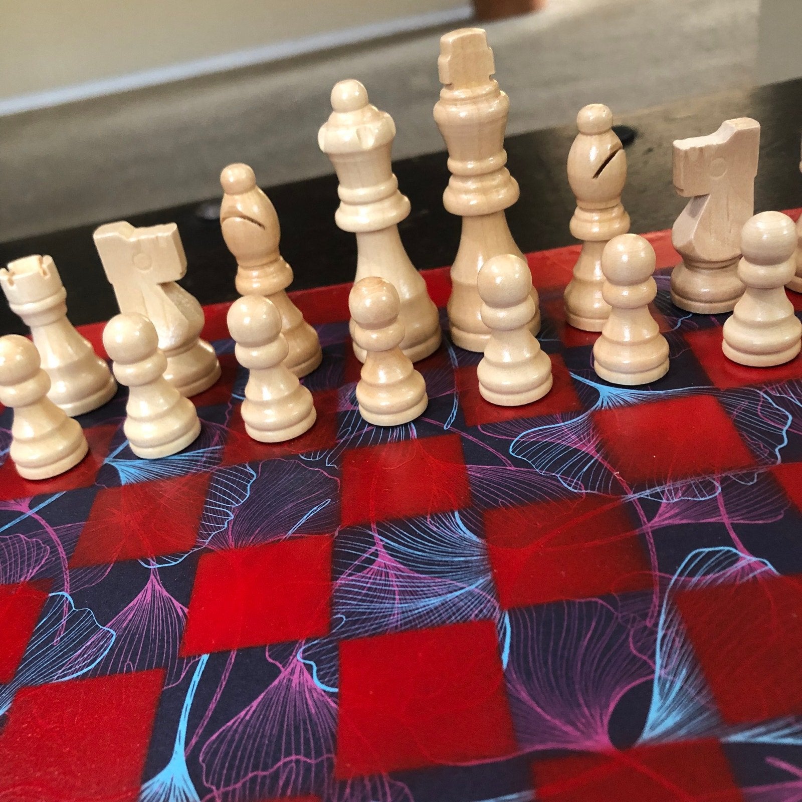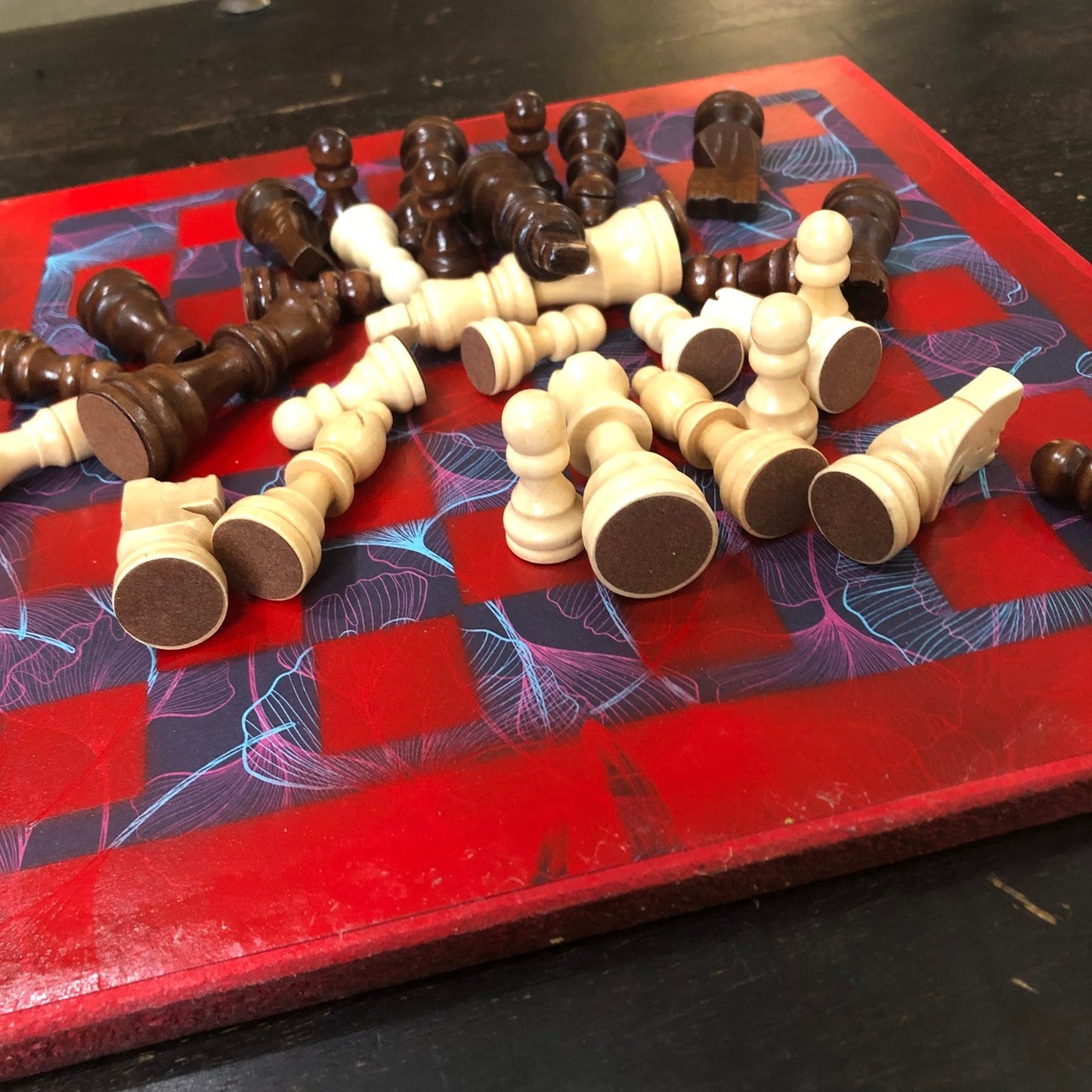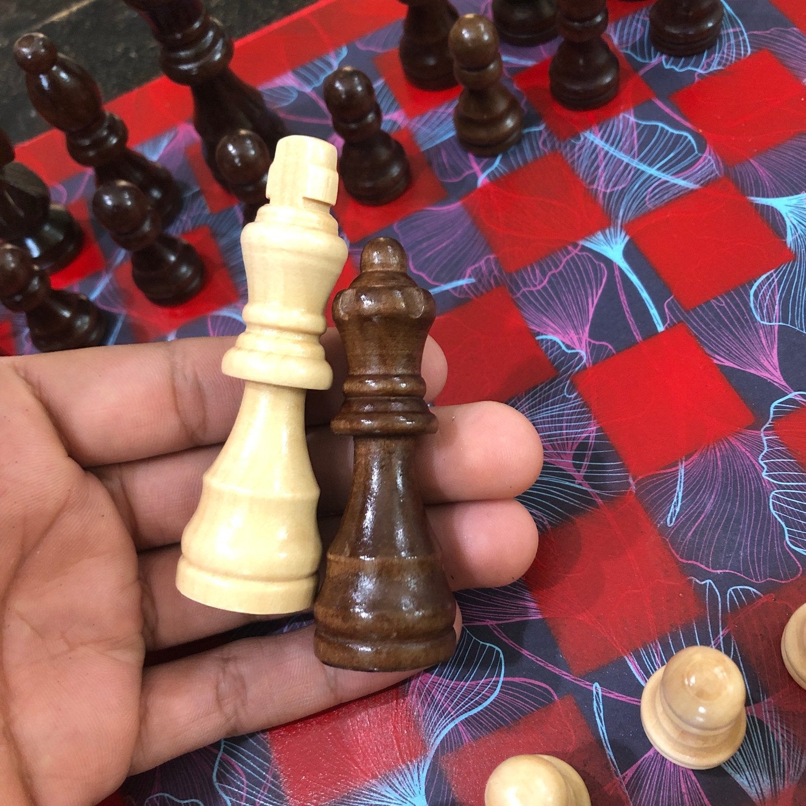Introducing our exclusive Handcrafted Wooden Chess Set, meticulously designed with precision and care. Measuring 12 inches by 12 inches, this chess set features a beautifully painted particle board layered with a sheet of scrapbook paper board that doubles as a work of art. Each set is a unique, one-of-a-kind creation, crafted by hand to ensure that no two sets are alike. Elevate your gaming experience with this exceptional chess set that combines vibrant design with the touch of artisan craftsmanship. This chess board comes with chess pieces and is handcrafted as a one of one