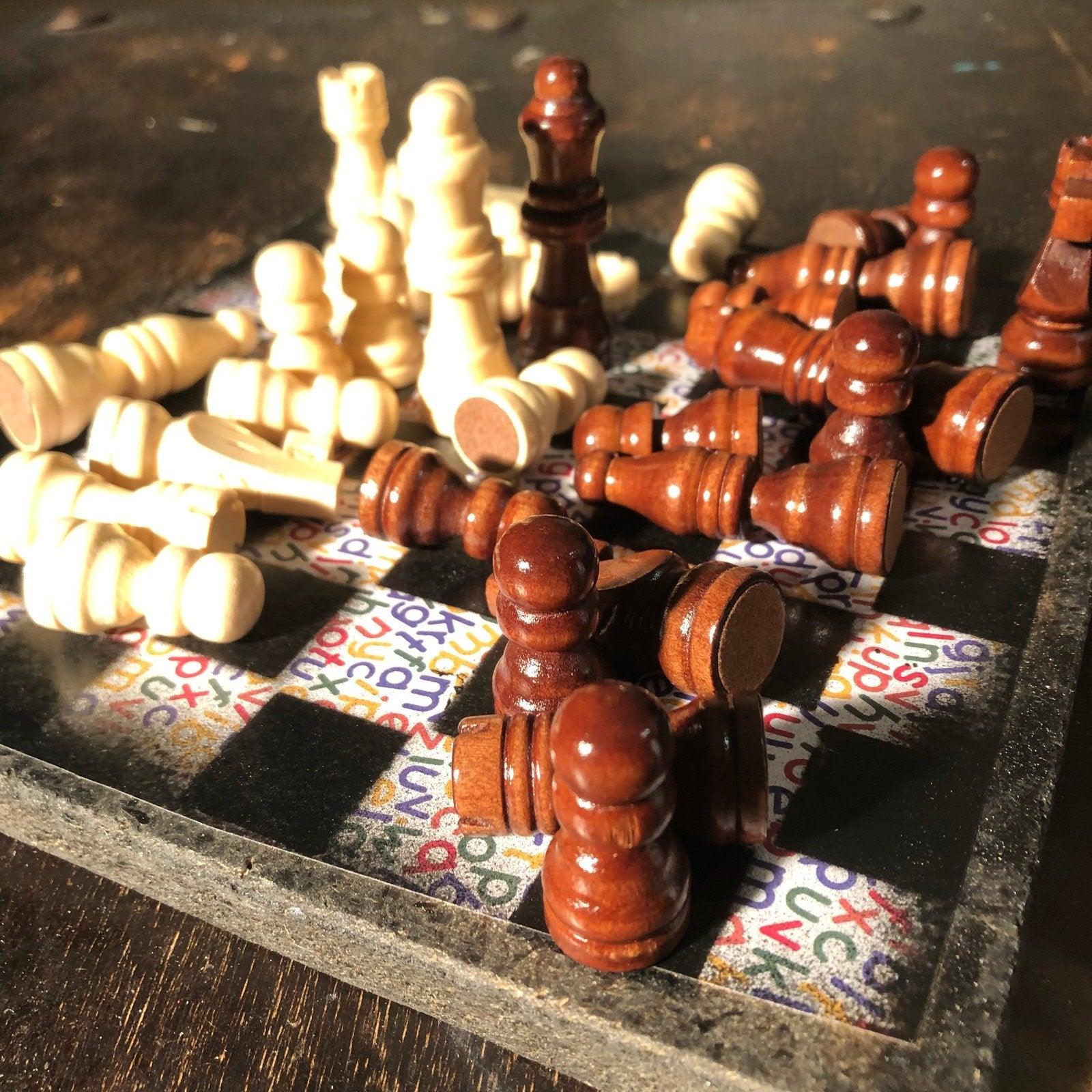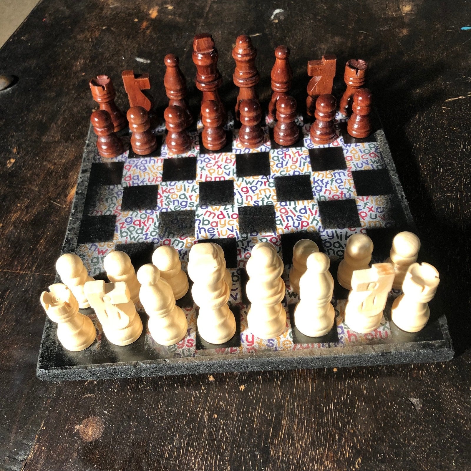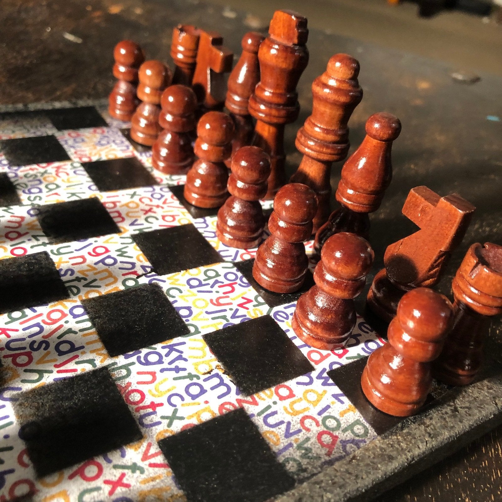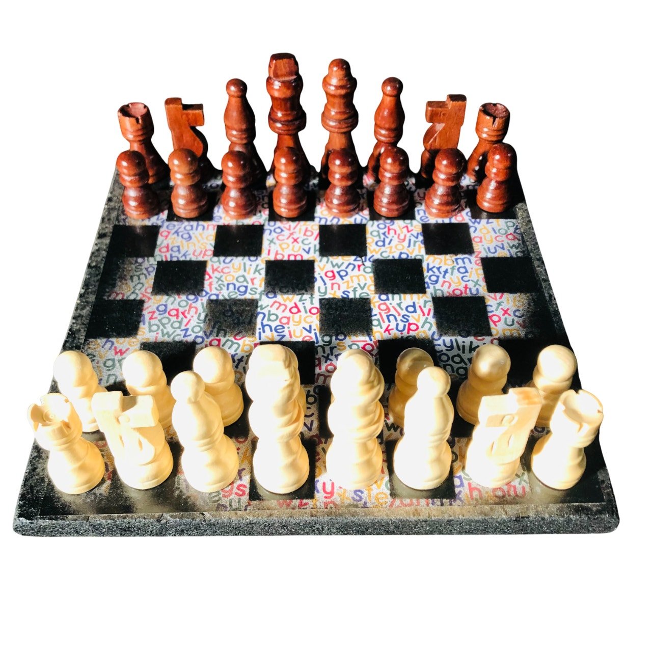 Introducing our exclusive Handcrafted Wooden Chess Set, meticulously designed with precision and care. Measuring 8 inches by 8 inches, this chess set features a beautifully painted particle board layered with a sheet of scrapbook paper board that doubles as a work of art. Each set is a unique, one-of-a-kind creation, crafted by hand to ensure that no two sets are alike. Elevate your gaming experience with this exceptional chess set that combines vibrant design with the touch of artisan craftsmanship. This chess board comes with chess pieces and is handcrafted as a one of one